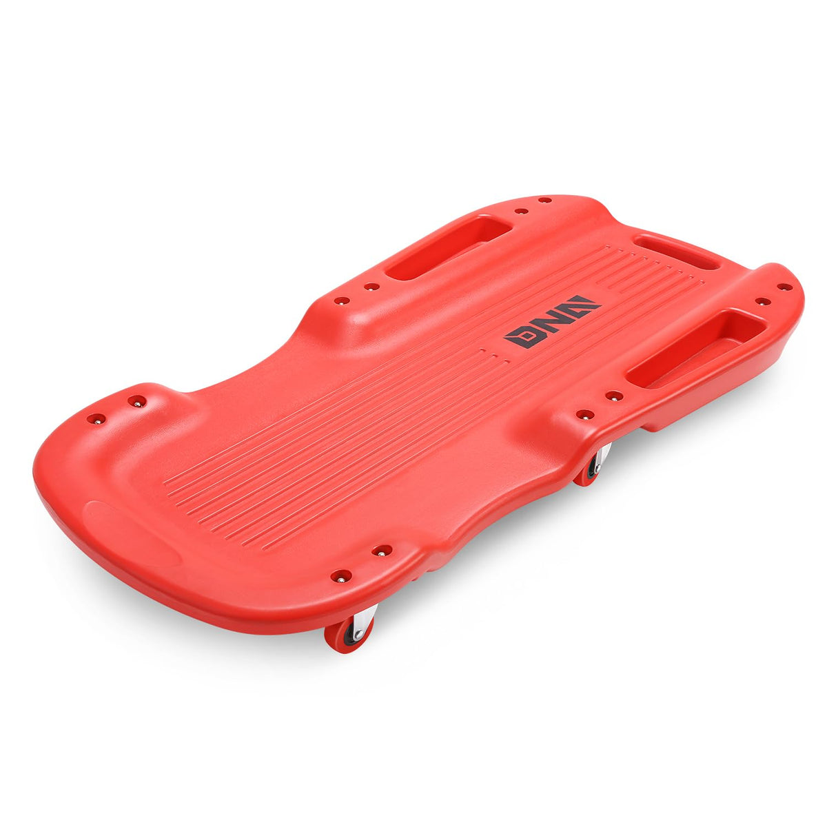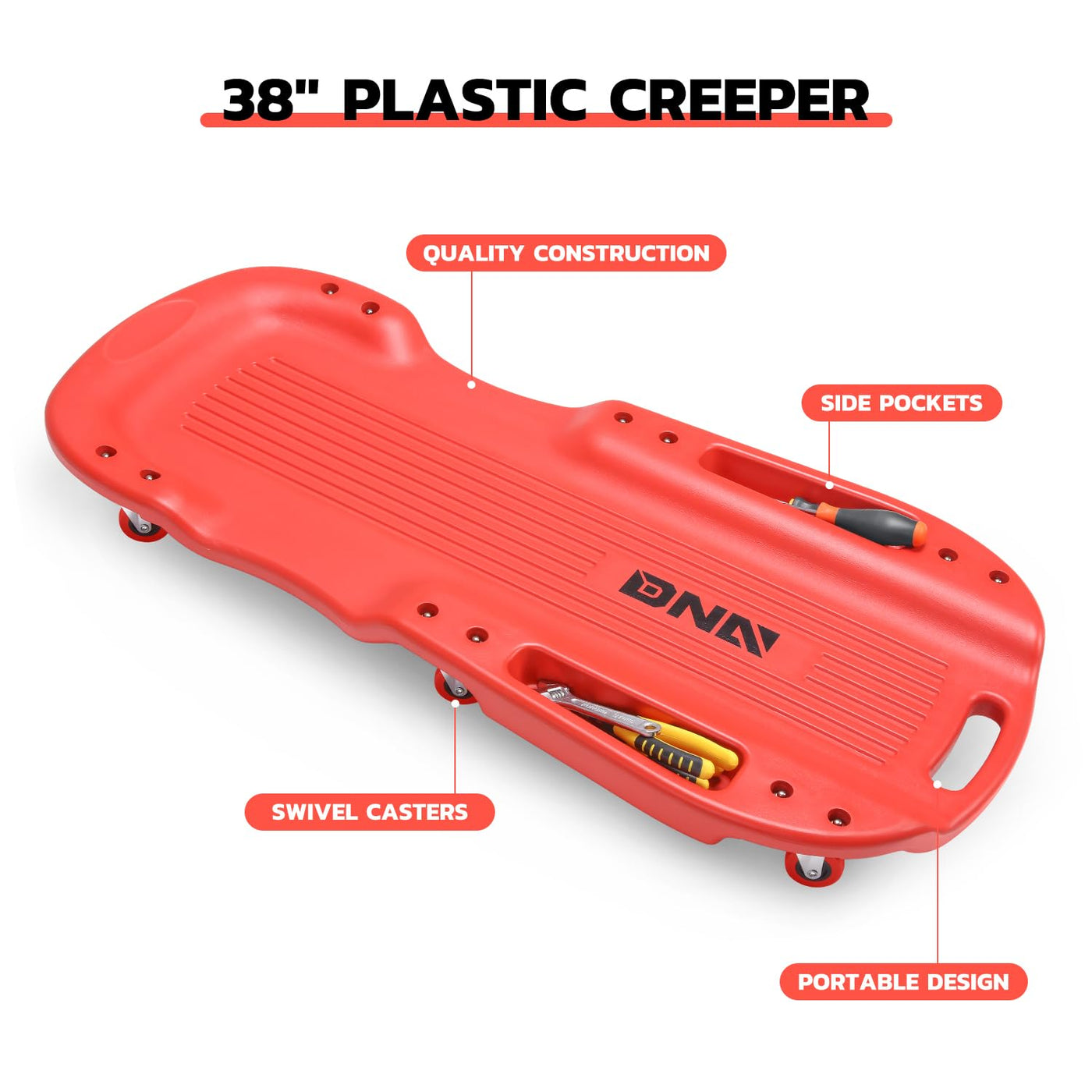 38'' CAR CREEPER - One-piece, blow molded roller creeper and has a low-profile design making it comfortable to work. Ideal for sliding in and out from the automotive confined spaces. | ADVANCED DESIGN - Rugged ergonomics design with the impact resistant to provide extra comfort for users. Molded plastic deck is designed to fit shoulders and hips comfortably. | WORK EASIER - Designed with 6pcs 360-degree swivel casters which deliver smooth and precise movements around your garage, making work routine take less time. Has side pockets for holding tools & bolts. | ROLLING GARAGE SHOP CREEPER - A perfect portable creeper for the automotive engineers. Built-in carry handles for easy carry, storage. The lightweight construction makes it easy to carry. | HIGH-QUALITY DNA TOOLS - Each item in our collection is the result of significant research and development, as well as rigorous automotive application testing and fitments carried out by our highly qualified specialists. We test the material's strength and durability to guarantee that the tools arrive completely prepared for their intended use at the consumer's end.