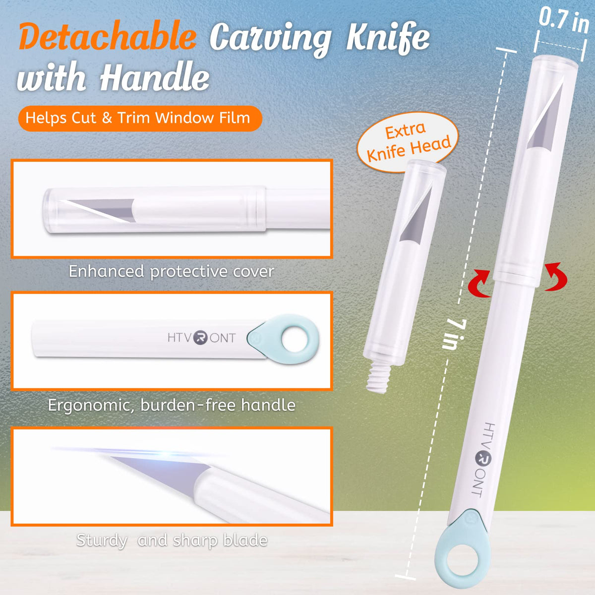Q: What precautions should I take while using the HTVRONT Window Film Kit?A: Always handle the knife with care as it is sharp. Keep it away from children and babies. Ensure that the squeegee is used gently to avoid scratching the surface during installation.