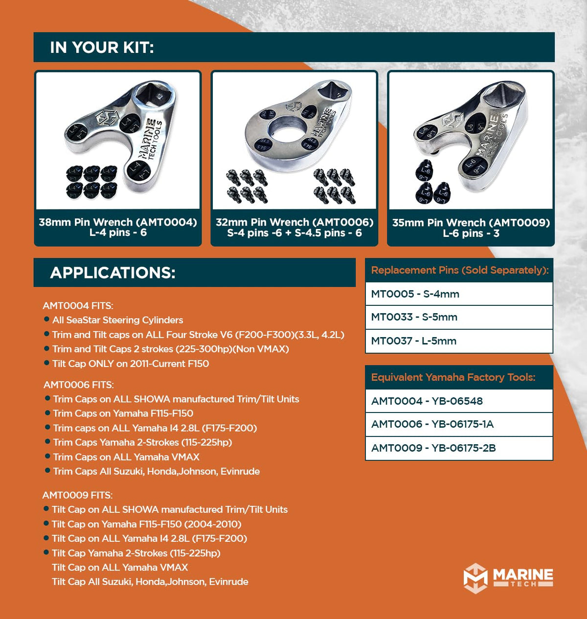 Q: What sizes of pin wrenches are included in the Marine Tech Tools Outboard Trim Tilt Pin Spanner Wrench Set?A: The Marine Tech Tools Outboard Trim Tilt Pin Spanner Wrench Set includes three sizes of pin wrenches: 38mm (AMT0004), 32mm (AMT0006), and 35mm (AMT0009). These sizes are compatible with most Yamaha, Suzuki, Johnson, and Evinrude hydraulic trim/tilt end caps.