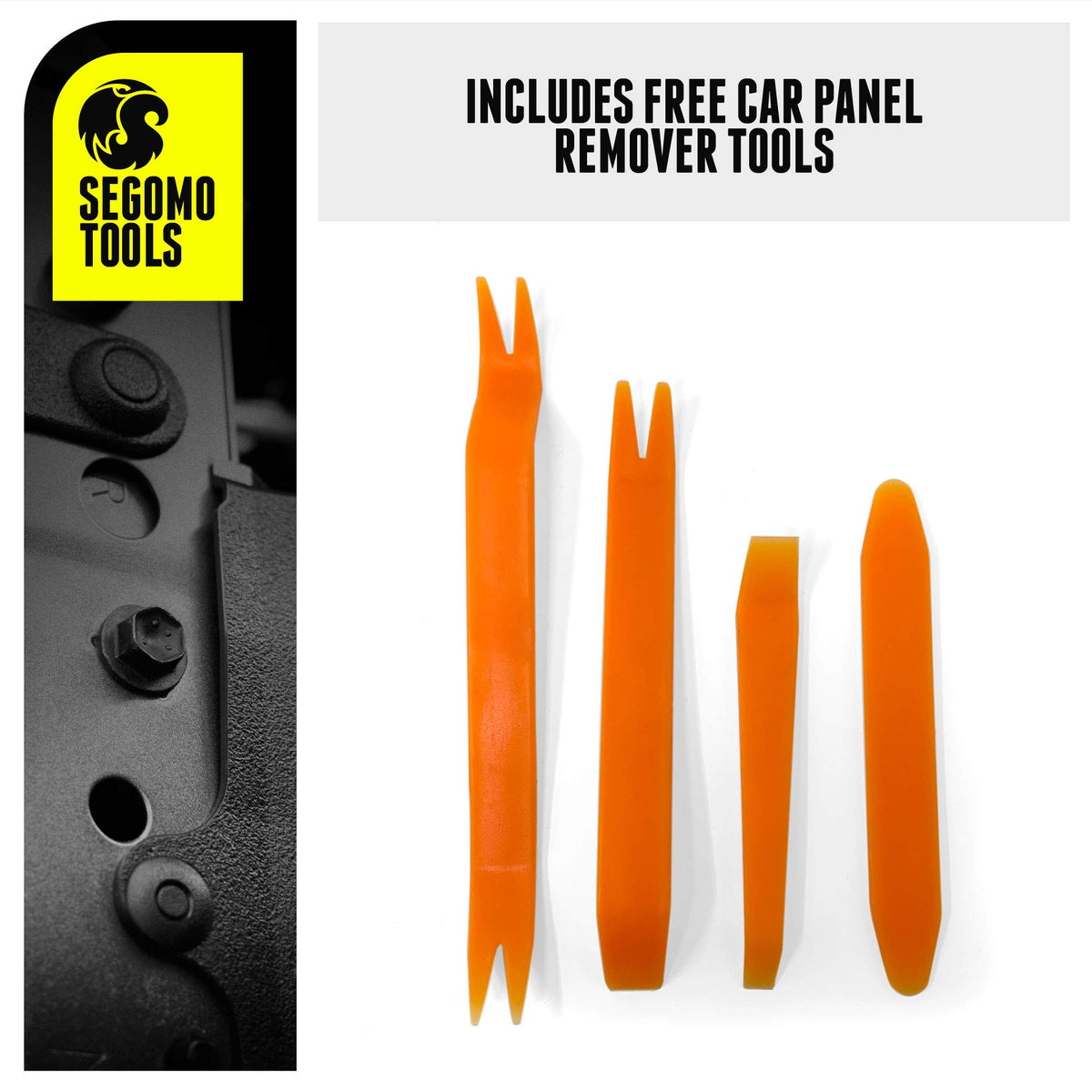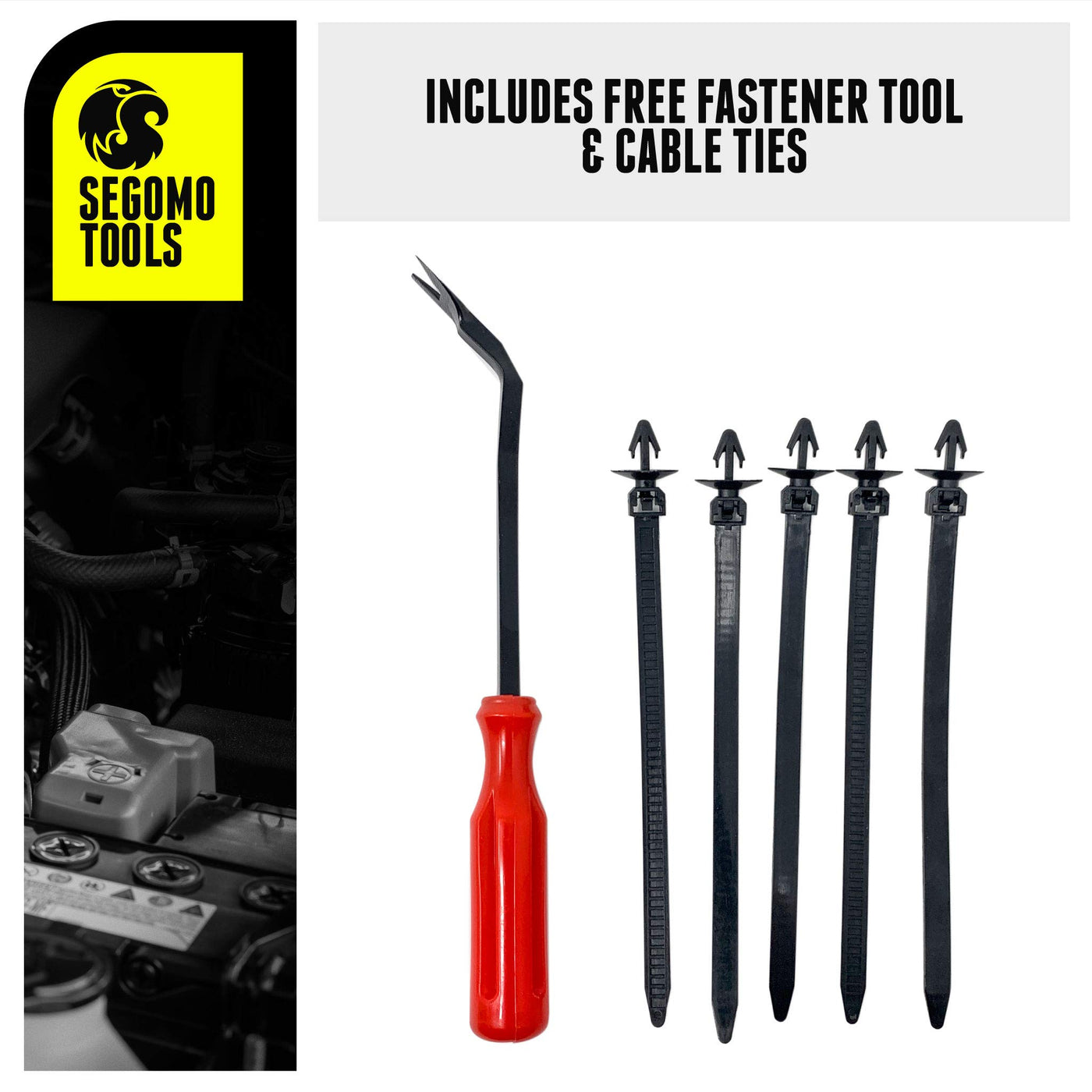 Q: What tools are included in the Segomo Tools kit?A: The kit comes with a fastener tool, cable ties, and car panel removal tools, providing everything you need to easily install or remove the clips.