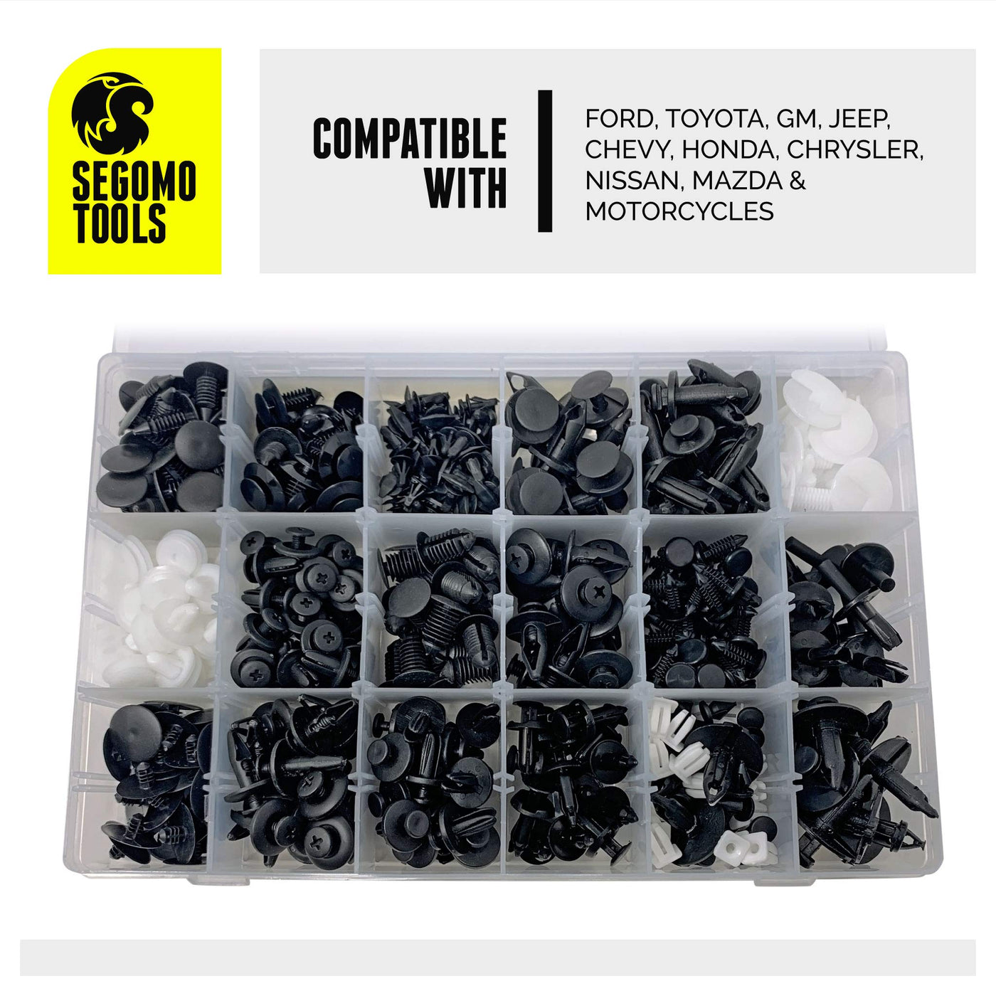 Q: What types of vehicles are compatible with the Segomo Tools 435 Piece Car Retainer Kit?A: The Segomo Tools 435 Piece Car Retainer Kit is compatible with a wide range of vehicles, including Ford, Toyota, GM, Jeep, Chevy, Honda, Chrysler, Nissan, Mazda, and motorcycles. The included clips cover hole sizes from 6mm to 10mm, making them versatile for various car models.