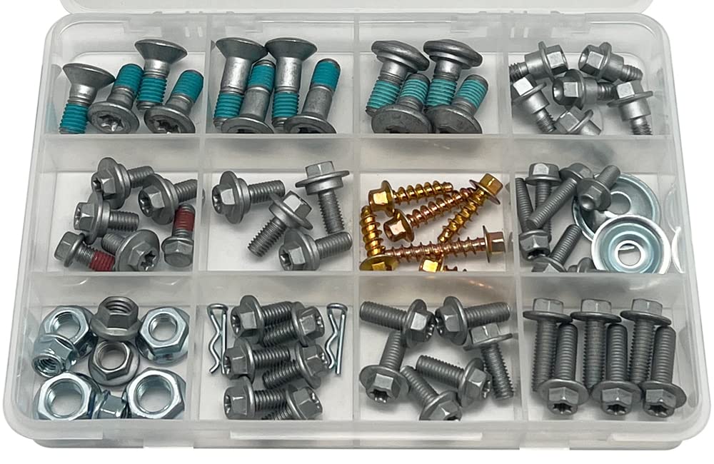 Q: What essential fasteners are included in the kit?A: This kit includes crucial fasteners such as M8 subframe bolts, Euro fork guard bolts, Gold ejot screws, Euro wide flange bolts, brake rotor bolts, flange nuts, and other vital components necessary for most track or trail side repairs.