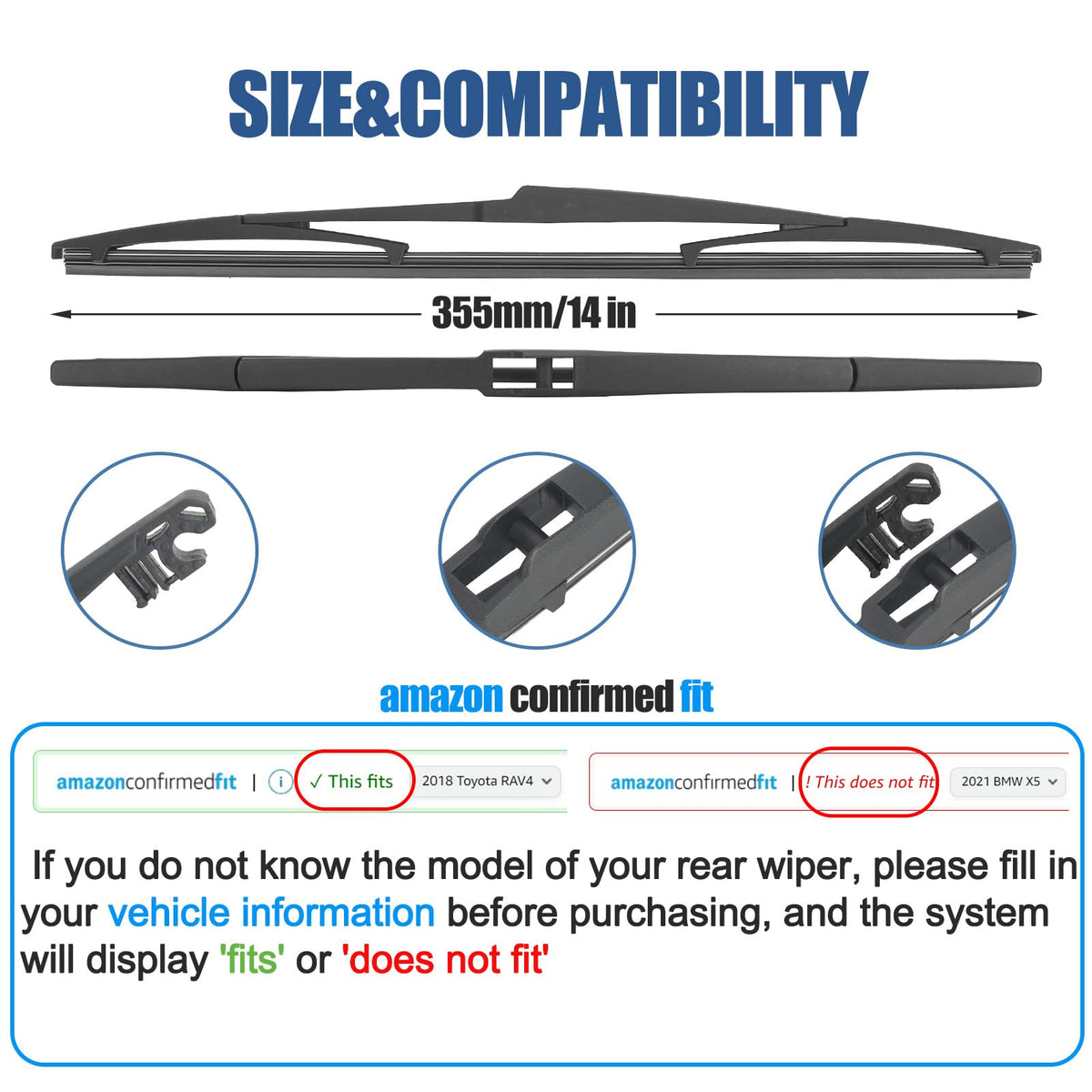 Q: What vehicles are compatible with the 14" Rear Wiper Blade?A: The 14" Rear Wiper Blade is compatible with various models including Jeep Cherokee (2014-2022), Dodge Journey (2009-2020), Hyundai Accent (2006-2011), Santa Fe (2007-2012), Tucson (2016-2021), and Kia Rio (2006-2011), among others. For a full compatibility list, please refer to the product description or use the Amazon fit tool.
