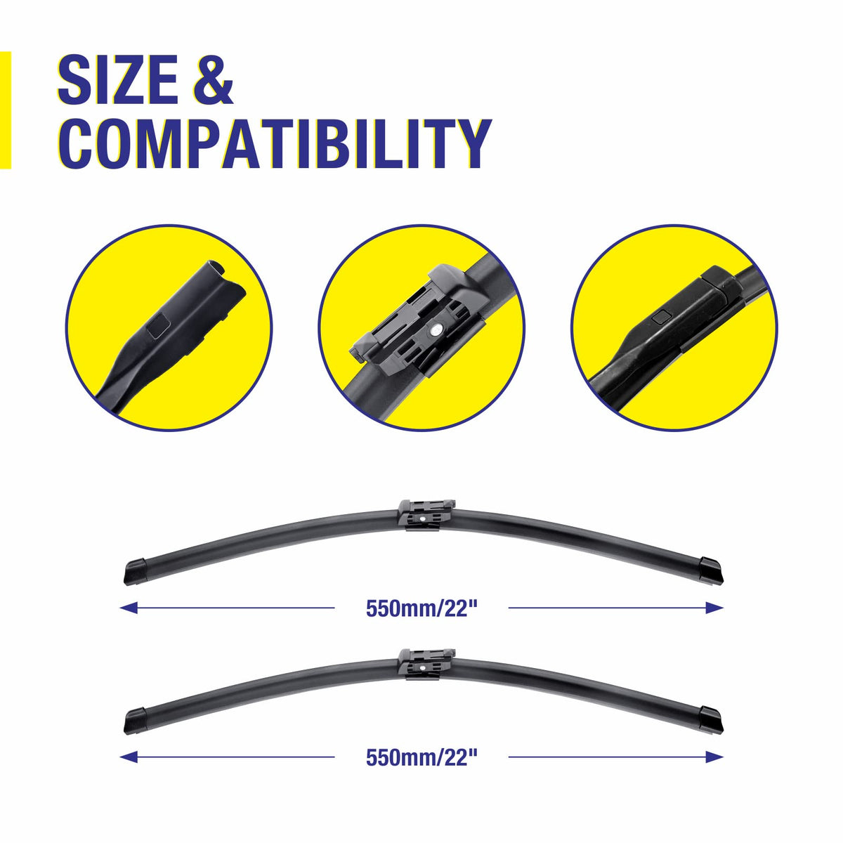 Q: What vehicles are compatible with these windshield wiper blades?A: These 22" windshield wiper blades are specifically designed as a replacement for VW VOLKSWAGEN Beetle models from 2012 to 2018, ensuring a perfect fit and optimal performance.