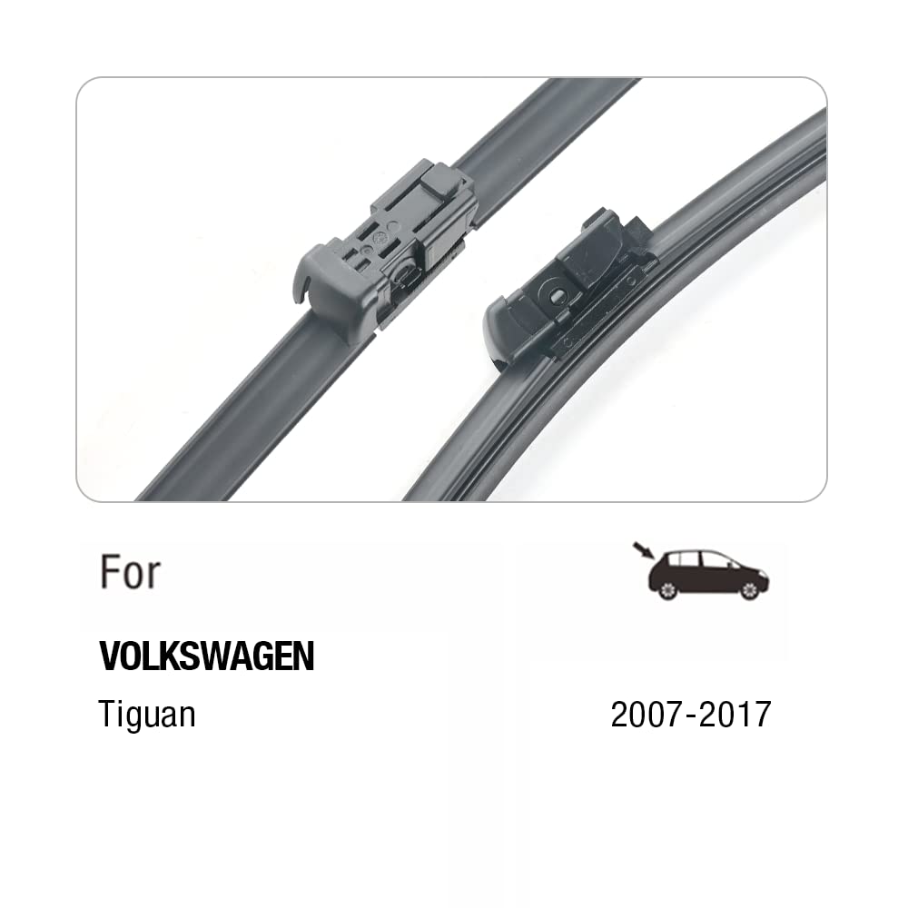 Q: What vehicles are compatible with the 24"+21" Windshield Wiper Blades?A: These wiper blades are specifically designed as a replacement for the 2007-2017 VW Volkswagen Tiguan MK1 and are also compatible with Chevrolet Malibu from 2009-2012, Traverse from 2009-2011, Buick Enclave from 2008-2011, and Saturn Outlook from 2007-2010, as well as Aura from 2008-2009.