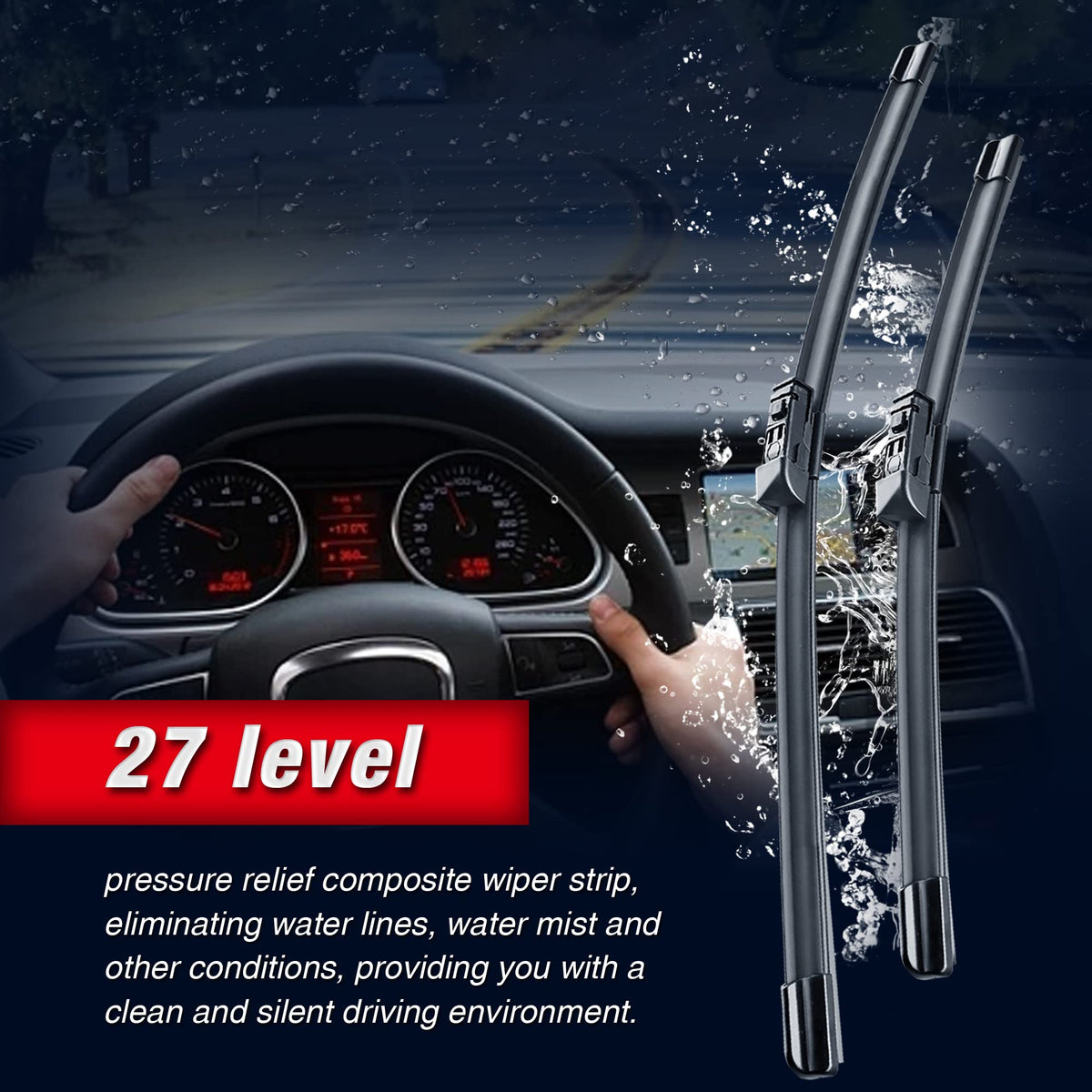 Q: How do these wiper blades perform in adverse weather conditions?A: The wiper blades are designed to have a stronger grip on the windshield, reducing head-on wind resistance and effectively clearing water marks, ensuring optimal visibility even in rain or snow.