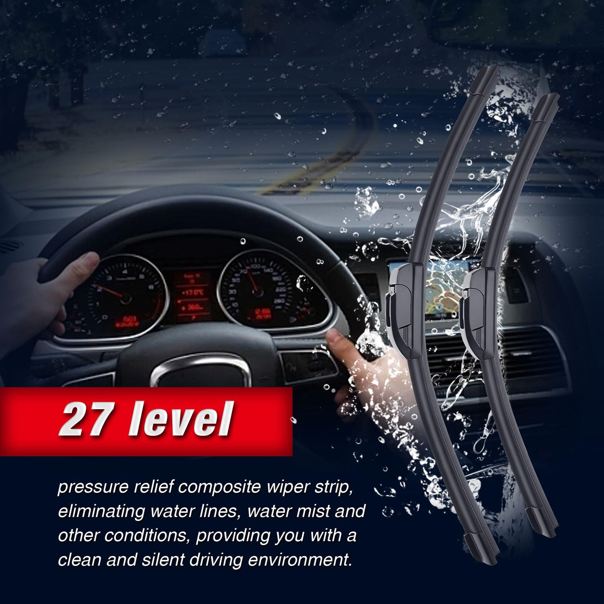 Q: How do these wiper blades improve visibility during rain?A: The wiper blades feature a strong grip on the glass, reducing wind resistance and minimizing water marks, which enhances visibility and ensures a clearer view during inclement weather.