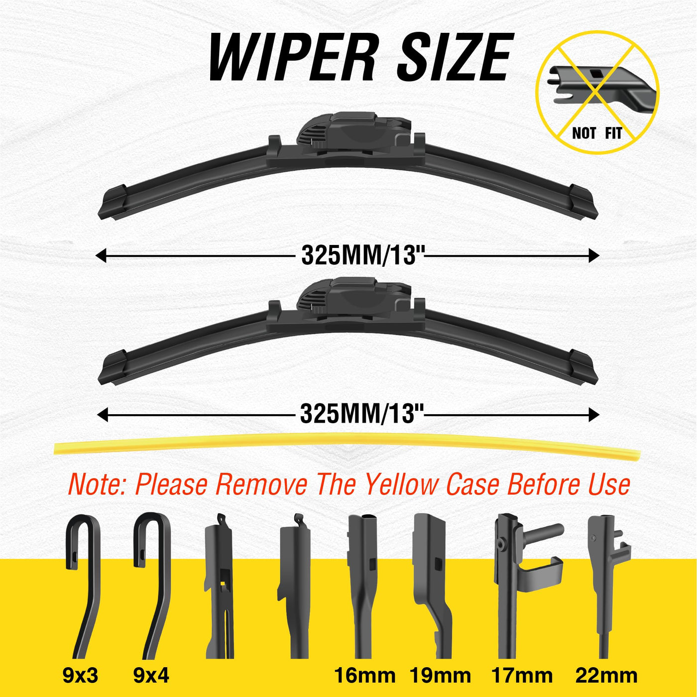 Q: How do I install the 13"+13" wiper blades?A: To install the wiper blades, first ensure your wiper arms are compatible (Hook/Top Lock 16MM or 19MM/Pinch Tab/Side Lock ARM). Remove the yellow protective rubber strip before installation, then follow the manufacturer's instructions for securing the blades onto the wiper arms.