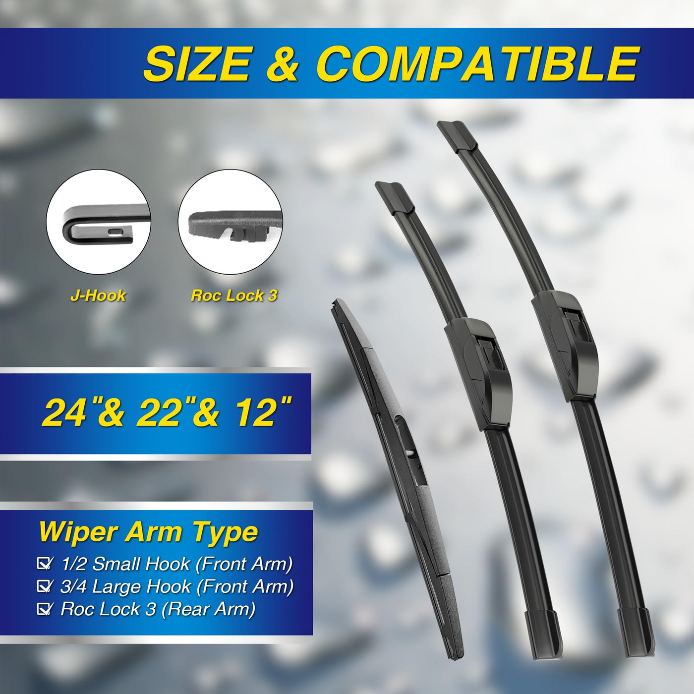 Q: What vehicles are compatible with the 5 PLUS Silicone Windshield Wipers?A: The 5 PLUS Silicone Windshield Wipers are compatible with the 2005-2015 Nissan Armada, 2004-2010 Infiniti QX56, and 2011-2014 Acura TSX. They come in a set of 3 wiper blades measuring 24", 22", and 12".