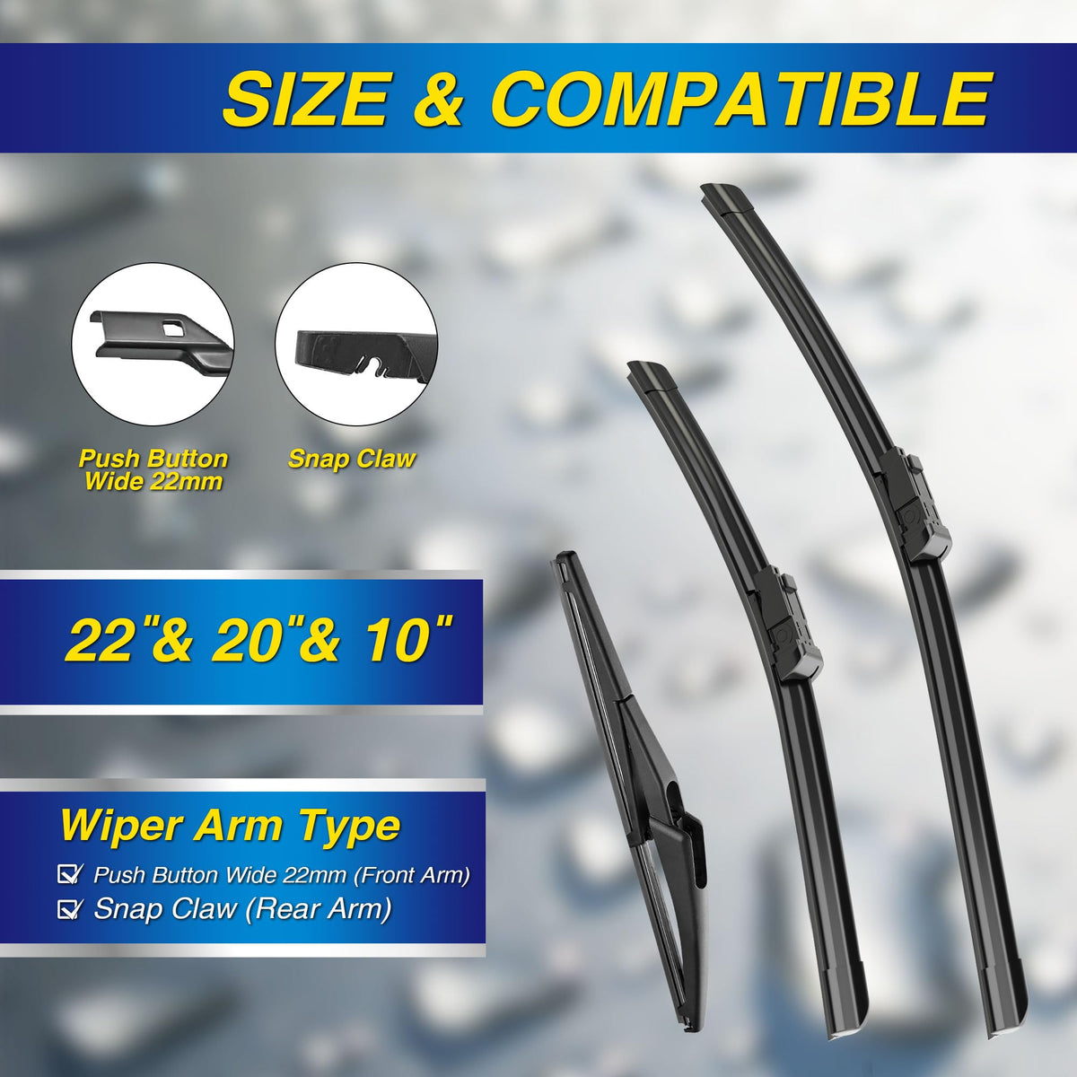 Q: What vehicles are compatible with the 5 PLUS® Windshield Wiper Blades?A: The 5 PLUS® Windshield Wiper Blades are specifically designed for the 2015-2023 Jeep Renegade. They come in a pack of 3, including sizes 22", 20", and 10", ensuring a perfect fit for your vehicle.