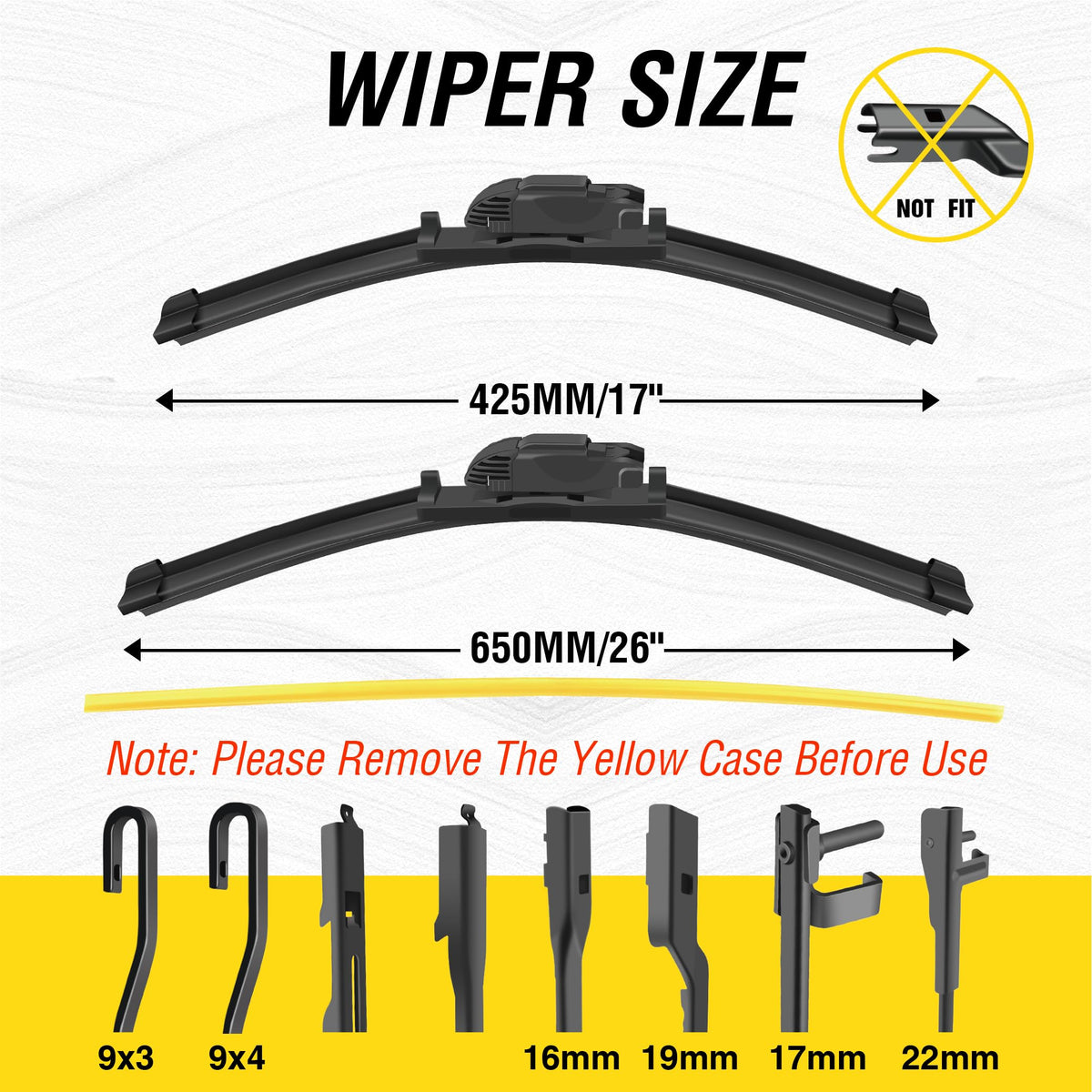 Q: What sizes do these windshield wipers come in?A: This set includes two windshield wipers: one 26-inch blade and one 17-inch blade, designed to provide optimal coverage and performance for your vehicle's windshield.