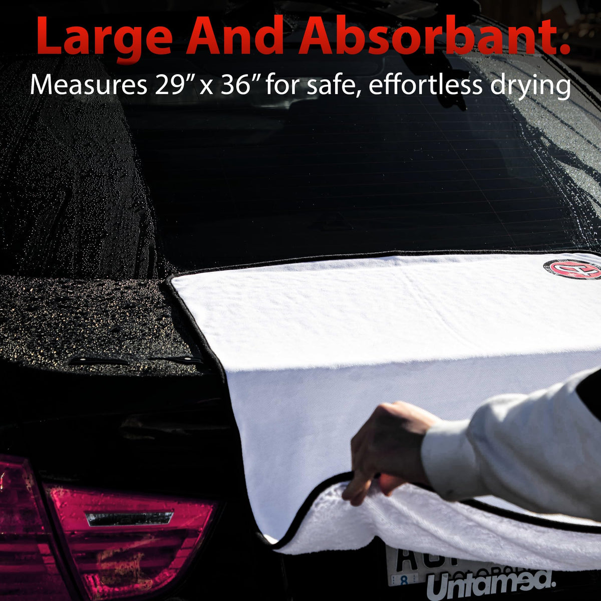 Adam's Ultra Plush Drying Towel is the perfect size to get the job done at a generous 29'' x 36''. Carefully fold the towel in half or in quarters with the thin side facing the surface. Mist the wet vehicle with a light amount of Detail Spray, which acts as a drying aid, will minimize the chance of water spots while drying, and add an extra kick of shine. Then lay the towel over the roof, and gently move it across the surface or pull the towel across the surface by two corners to remove every drop of water. Quickly work in a top-down method to dry the rest of the vehicle in this manner.