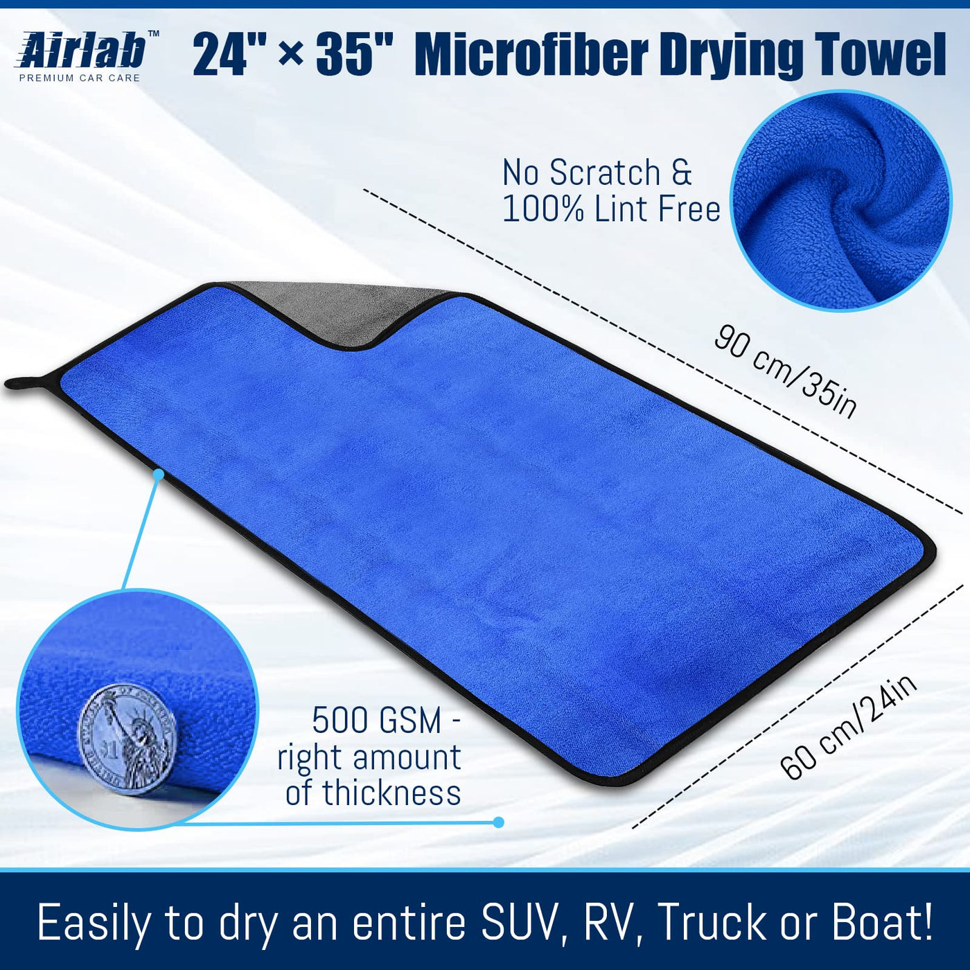 Q: What are the dimensions of the Airlab XL Microfiber Towel?A: The Airlab XL Microfiber Towel measures 24 inches by 35 inches, making it extra large and perfect for drying cars efficiently.