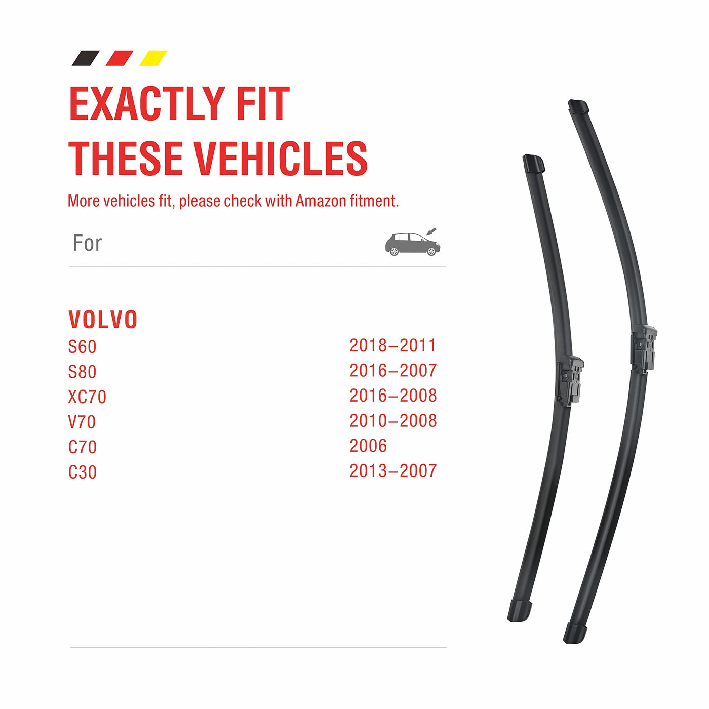 Q: What vehicles are compatible with the Beam Wiper Blades?A: The Beam Wiper Blades are designed to fit Volvo models S60 (2011-2018), S80 (2007-2016), and V60 (2013-2014). They come in a combination size of 26" for the driver's side and 20" for the passenger's side, featuring a Top Lock 19mm adapter.