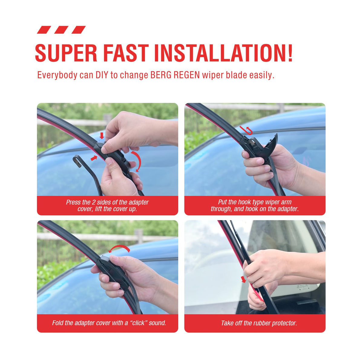 Q: How easy is it to install the windshield wiper blades?A: The installation of the BERG REGEN windshield wiper blades is quick and easy, taking only about 30 seconds. The user-friendly design allows for a hassle-free replacement process.
