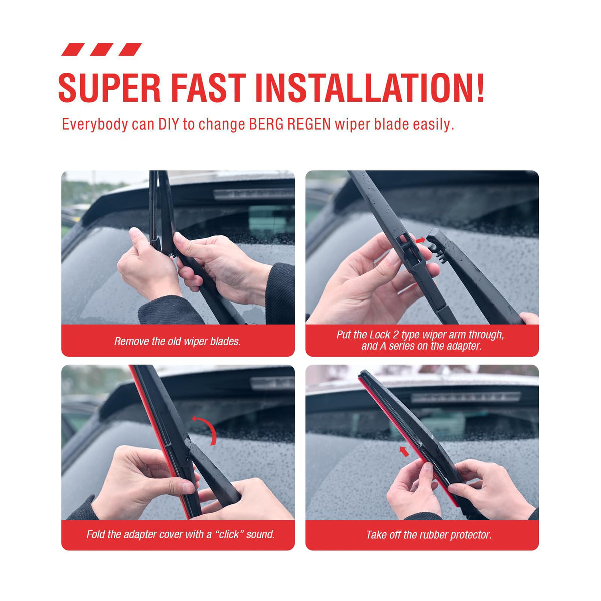 Q: How easy is it to install the BERG REGEN Rear Wiper Blades?A: Installing the BERG REGEN Rear Wiper Blades is quick and easy, taking approximately 30 seconds. The design allows for a straightforward installation process without the need for any special tools.