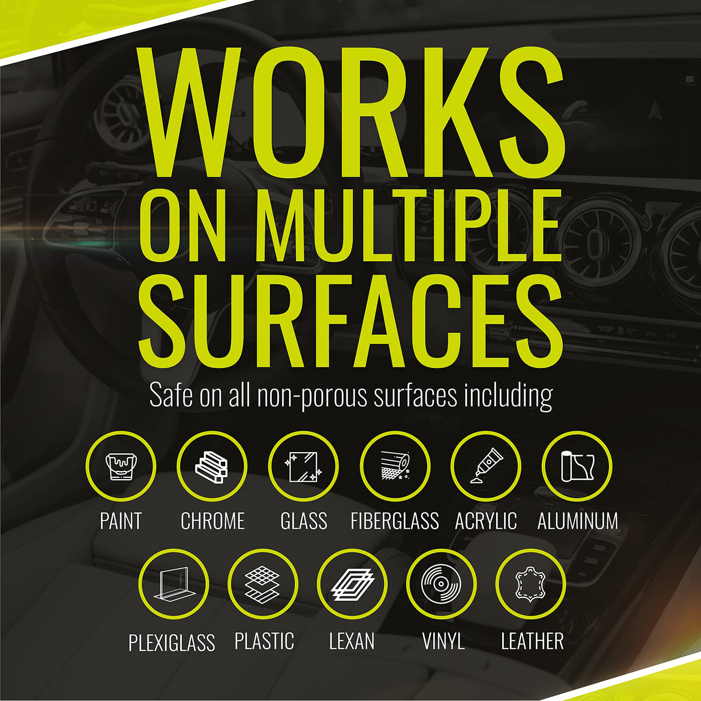 Q: What surfaces can I use the Bugslide Microfiber Mesh X-Treme Cleaning Cloth on?A: The Bugslide Microfiber Mesh X-Treme Cleaning Cloth is safe to use on all non-porous surfaces, including paint, chrome, glass, fiberglass, acrylic, aluminum, plastic, vinyl, leather, and Plexiglas.