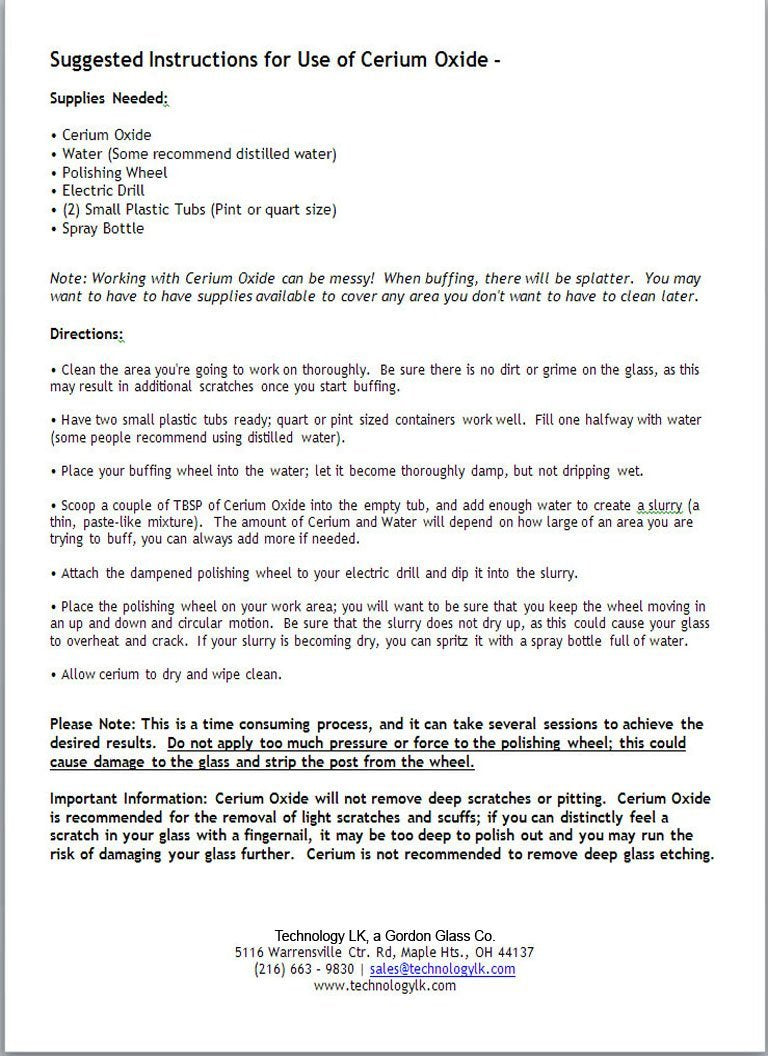 Gordon Glass High Grade Cerium Oxide: Contains No Zinc Gordon Glass Cerium Oxide is a high-quality polishing compound for removing fine scratches and scuff marks from glass and mirrors. Apply slurry of cerium oxide with a Felt Polishing Wheel to restore scratched glass, mirrors, even car headlights quickly and easily. High Grade Cerium Oxide: The Professional's glass polishing compound of choice Easily buff out light scratches, residue and stains from all types of glass and mirrors. Gordon Glass Company's Cerium Oxide is ideal for removing light scratches, scuffs and stains caused by calcification from all types of glass. It will even restore your car's headlights to like-new condition. A little goes a long way. Cerium oxide polishing compound can be left to dry and re-used simply by adding water. Product Information Applications Formula CeO2 They are suitable for recirculatory slurry systems and is compatible with all standard polishing pad interfaces. Appearance Pink or Red Brown Powder Typical Analysis Recommended Slurry Temperature Specifications CeO2 99.7 % 25 °C – 40 °C (77 °F - 104 °F) Loss on ignition at 1,000⅓C 1.00 % max Composition Other Rare Earths Non-Rare Earths La2O3 0.019 % Fe2O3 0.002 % Nd2O3 0.004 % SiO2 0.007 % Sm2O3 < 0.001 % CaO < 0.005 % Y2O3 0.003 % Na2O 0.15 % SrO < 0.001 % Physical Properties Dilution and Compatability Melting Point 2500⅓C The cerium oxide can be used in concentration between 2 ° and 10 ° Baume. For shape polishing and straight line beveling, concentration of 2 ° to 5 ° Baume is recommended. Specific Gravity 7.3 g/cm3 Composition REO Content 60 - 75% Average Particle Size 2.6 - 2.9 Microns pH 6.5 - 7.5 Solubility Insoluble in water, moderately soluble in strong mineral acids. Stability Slightly hygroscopic, will absorb small amounts of moisture and CO2 from the atmosphere. Complete Technical Data