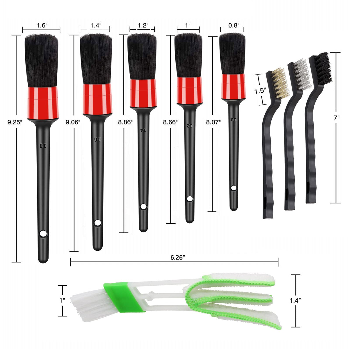 HMPLL 10Psc car detailing brush kit includes 5 boar hair car detailing brush, 3 wire brush, 2 car air vent brush. Size of each model: 10# length of 8.07 ” 12# length of 8.66 ” 14# length of 8.86 ” 16# length of 9.06 ” 18# length of 9.25 ” 3 Wire brushes length 7” 2 Air vent brush length 6.26”
