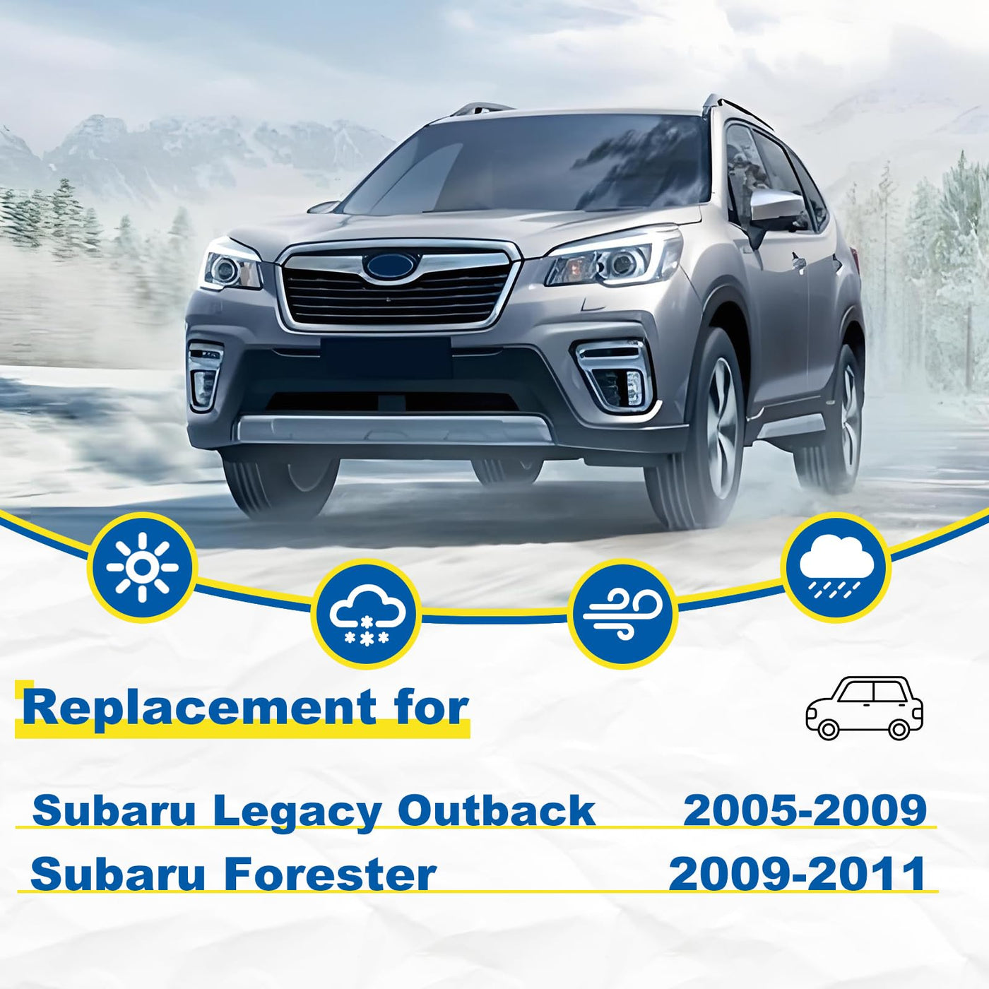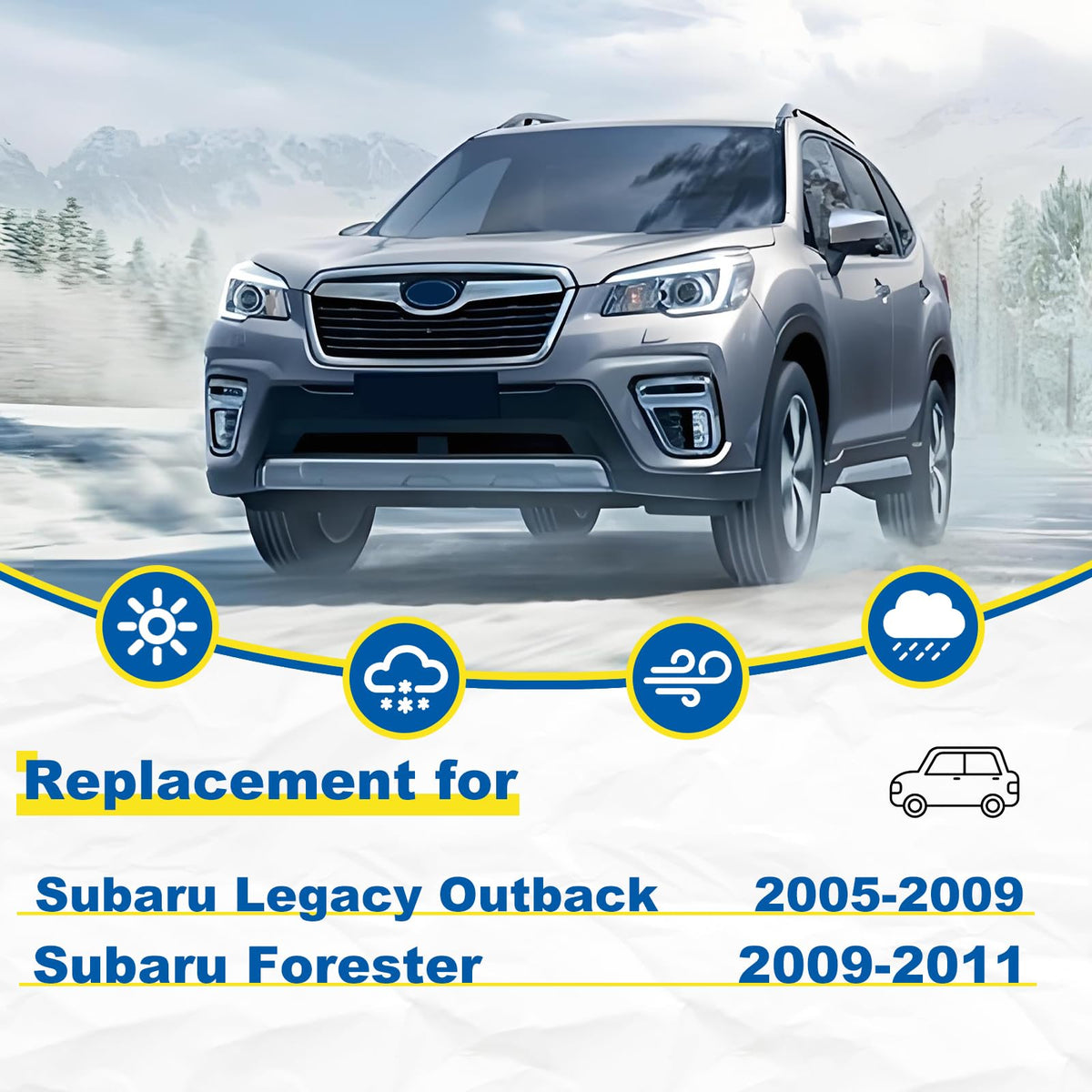 Q: What vehicles are compatible with the HRSNO windshield wipers?A: The HRSNO windshield wipers are designed as a replacement for Subaru Legacy (2005-2009), Subaru Forester (2009-2011), and Subaru Outback (2005-2009). These wipers ensure a perfect fit for these specific models, providing optimal performance.