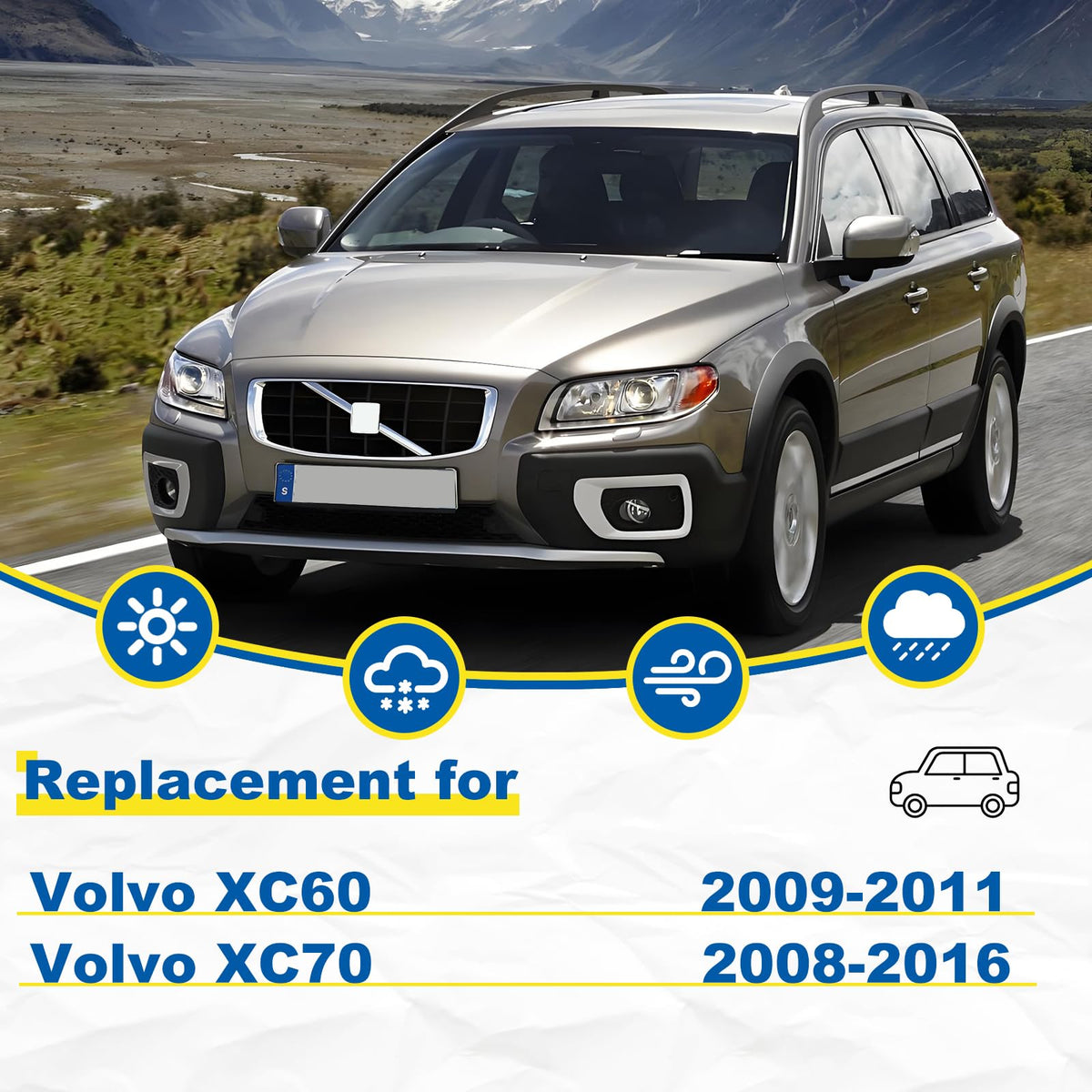 Q: What vehicles are compatible with the HRSNO windshield wipers?A: The HRSNO windshield wipers are designed to fit Volvo XC60 models from 2009 to 2011, Volvo XC70 from 2008 to 2016, and Volvo V70 from 2008 to 2017, ensuring a perfect fit for these specific vehicles.