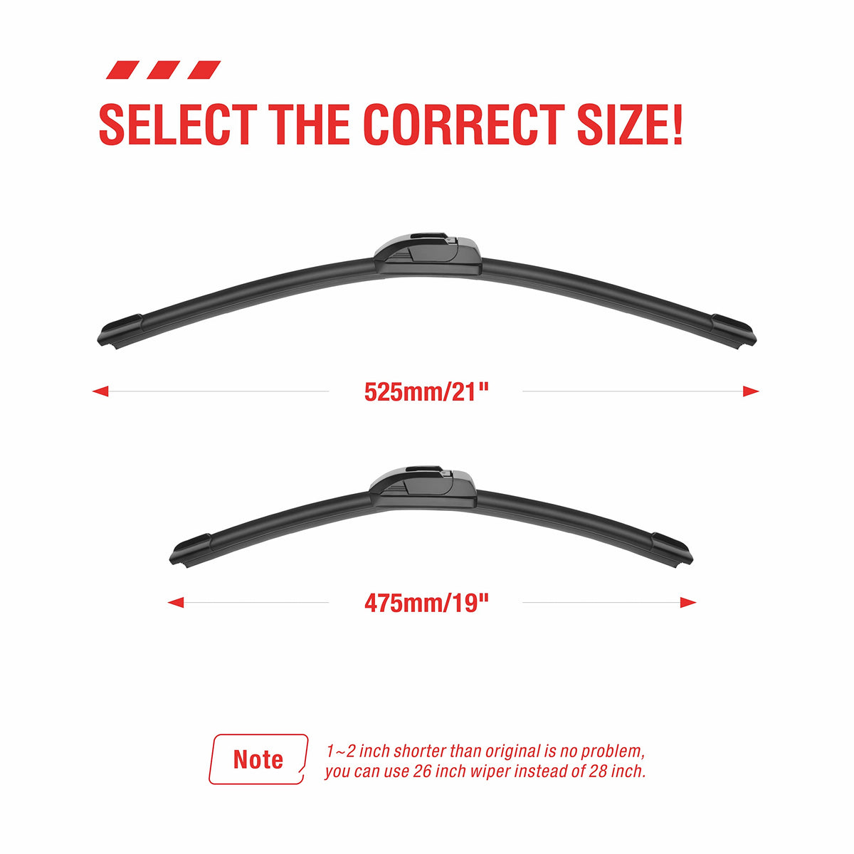 Q: What sizes do these wiper blades come in?A: The windshield wiper blades come in a pair, with sizes of 21 inches and 19 inches, which are the same dimensions as the original equipment (OE) wipers.