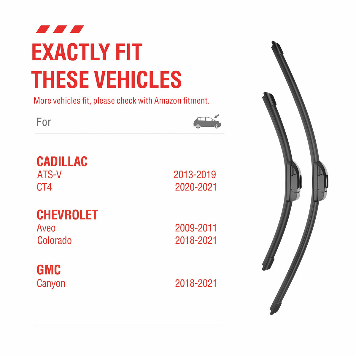 Q: What vehicles are compatible with the OEM Quality Performance Premium Windshield Wiper Blades?A: These wiper blades are specifically designed to fit Colorado models from 2018 to 2022, Aveo models from 2009 to 2011, and Canyon models from 2018 to 2020, among other vehicles.