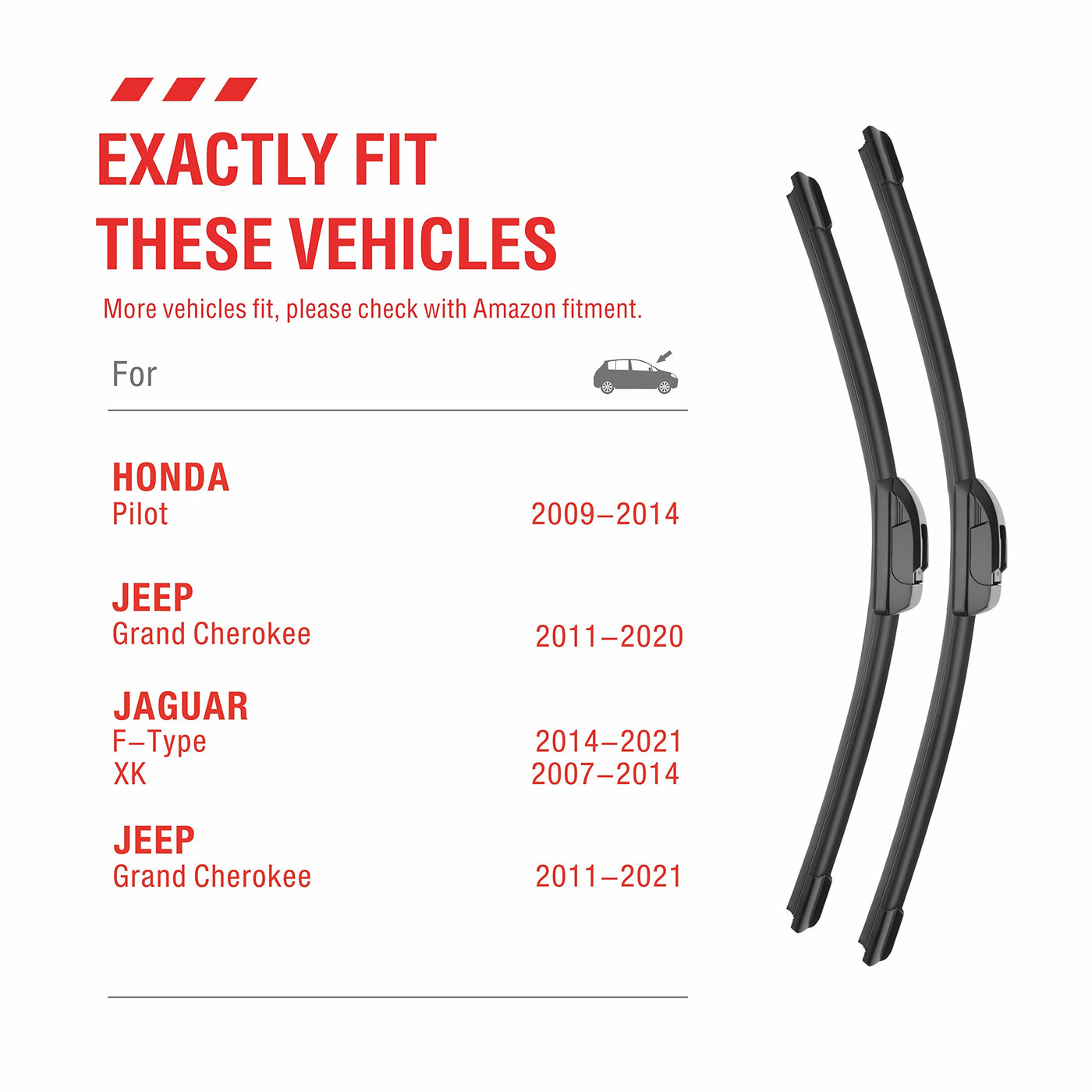 Berg Regen Windshield Wiper Blades And Ream Implement The Quality And Production Standard 30% Higher Than Oem. Exactly Fit For: Nissan Pathfinder 1999-2004 Honda Pilot 2009-2014 Jaguar F-Type 2014-2021 Jaguar Xk 2007-2014 Jeep Grand Cherokee 2011-2021 Windshield Wiper Blade: 22 + 21 Inch / 550 + 525 Mm Product Features: Flexible To Touch The Full Area Same Size (22 + 21 ) As Genuine Oe Wiper Durable For 1 Full Year Silence Wiping Technology, No Noise&Nbsp; Package Includes: 2X Windshield Wiper Blades 1X Installation Instruction&Nbsp; Note: Please Make Sure Your Car Meet The Car Models Listed In Up; Please Remove The Red Rubber Protector Before Use; If You Have Any Question Or Problem, Please Feel Free To Contact Us, We Promise To Try Our Best To Solve Any Problem; Your Satisfaction Is Our Top Concern. Please Contact Us To Solve Any Issue Before Leaving Neutral Or Negative Feedback.&Nbsp; Guarantee: All Berg Regen Windshield Wiper Blades And Rear Wipers Can Be Return In 200 Days With No Reason, With 12 Months Life Warranty, You Can Contact Our 7X24 Hours Service Team At Any Time. &Nbsp;