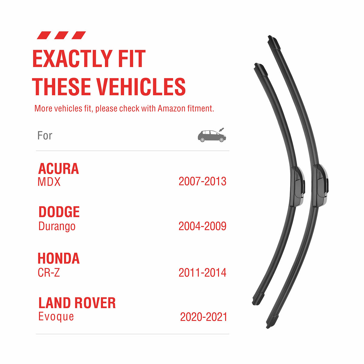 Q: What vehicles are compatible with the OEM Quality Performance Premium wiper blades?A: These wiper blades are specifically designed to fit Acura MDX models from 2007 to 2013, Dodge Durango models from 2004 to 2009, and Honda CR-Z models from 2011 to 2014, along with other compatible vehicles.