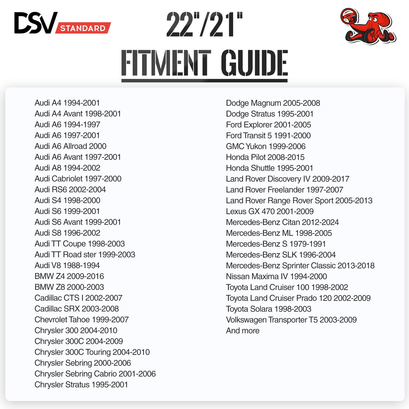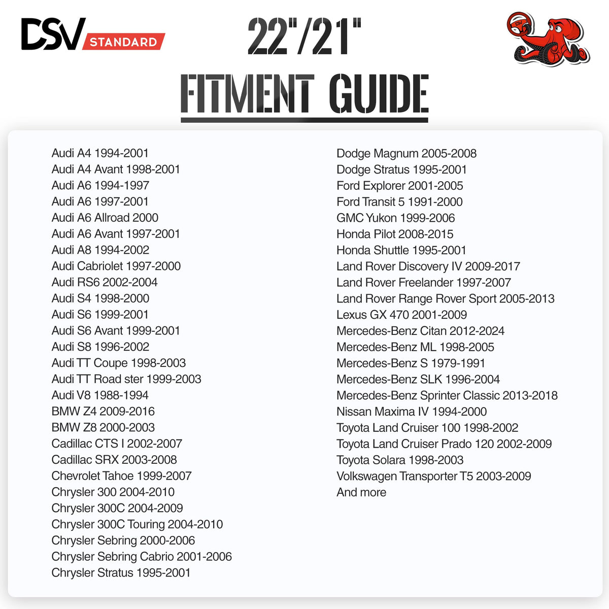 Q: What sizes are available for the DSV Windshield Wiper Blades?A: The DSV Windshield Wiper Blades are available in two sizes: 22 inches and 21 inches. It's essential to measure your existing windshield wipers to select the appropriate size for your vehicle.