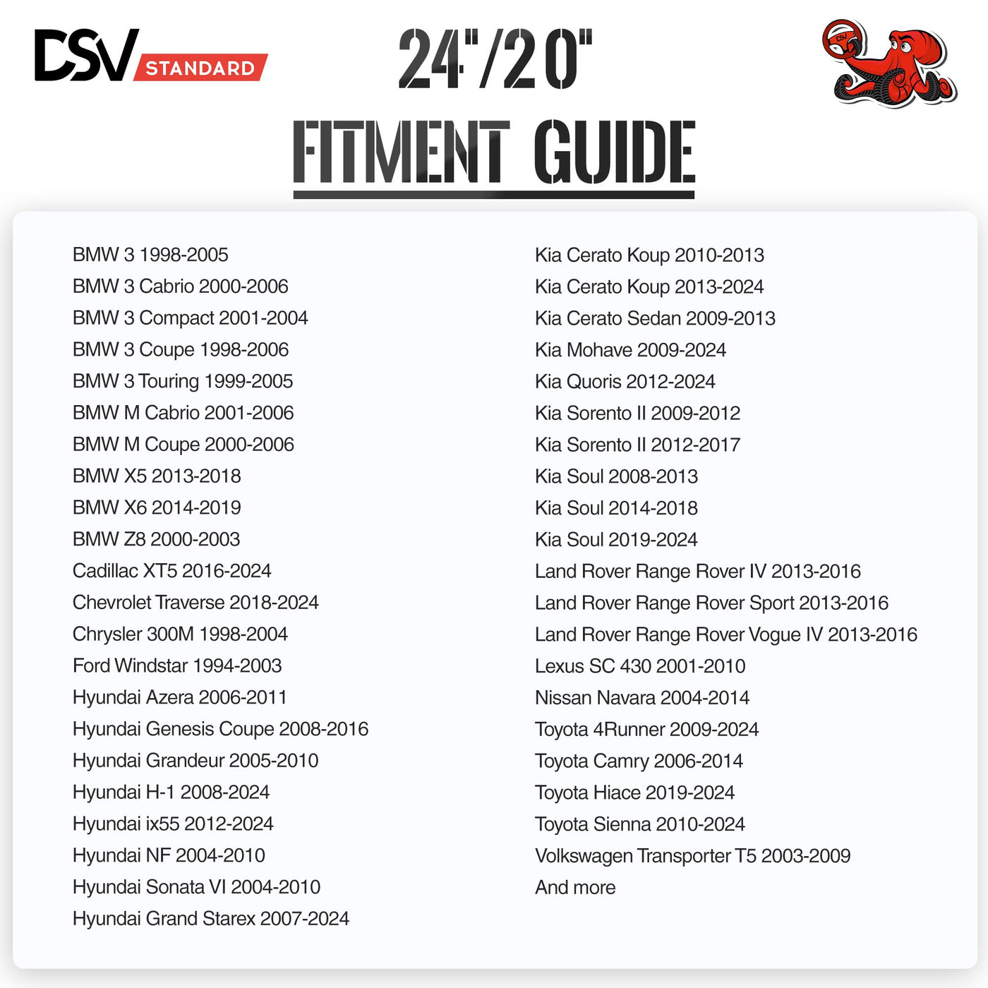 Q: What sizes do the DSV Windshield Wiper Blades come in?A: The DSV Windshield Wiper Blades are available in sizes 24 inches and 20 inches, making them suitable for various vehicles that require different sizes for driver-side and passenger-side wipers.