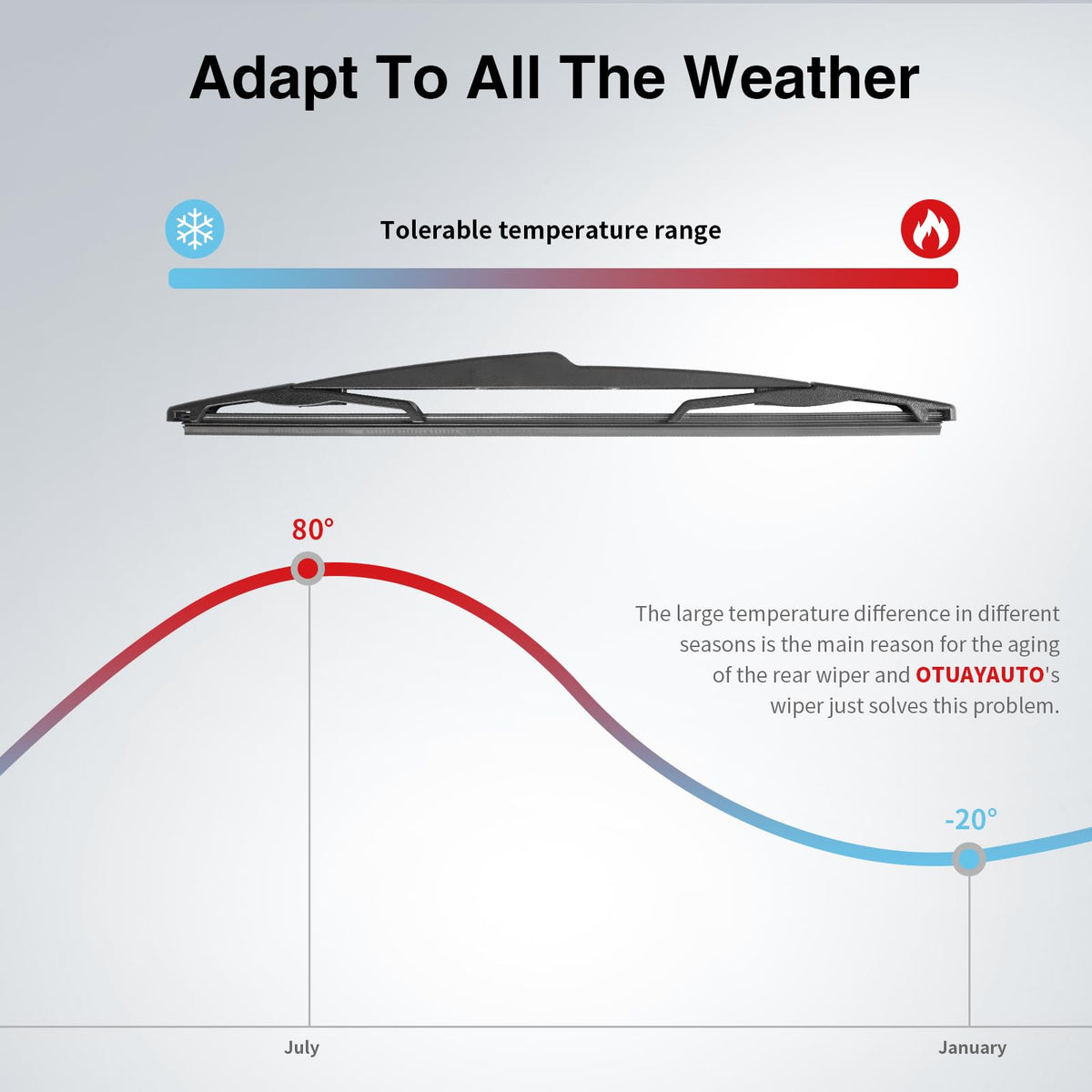 Q: What materials are used in the construction of the rear wiper arm and blade?A: The OTUAYAUTO Rear Wiper Arm and Blade are made with durable alloy steel, featuring a synthetic blend rubber squeegee that can withstand extreme weather conditions for enhanced durability.
