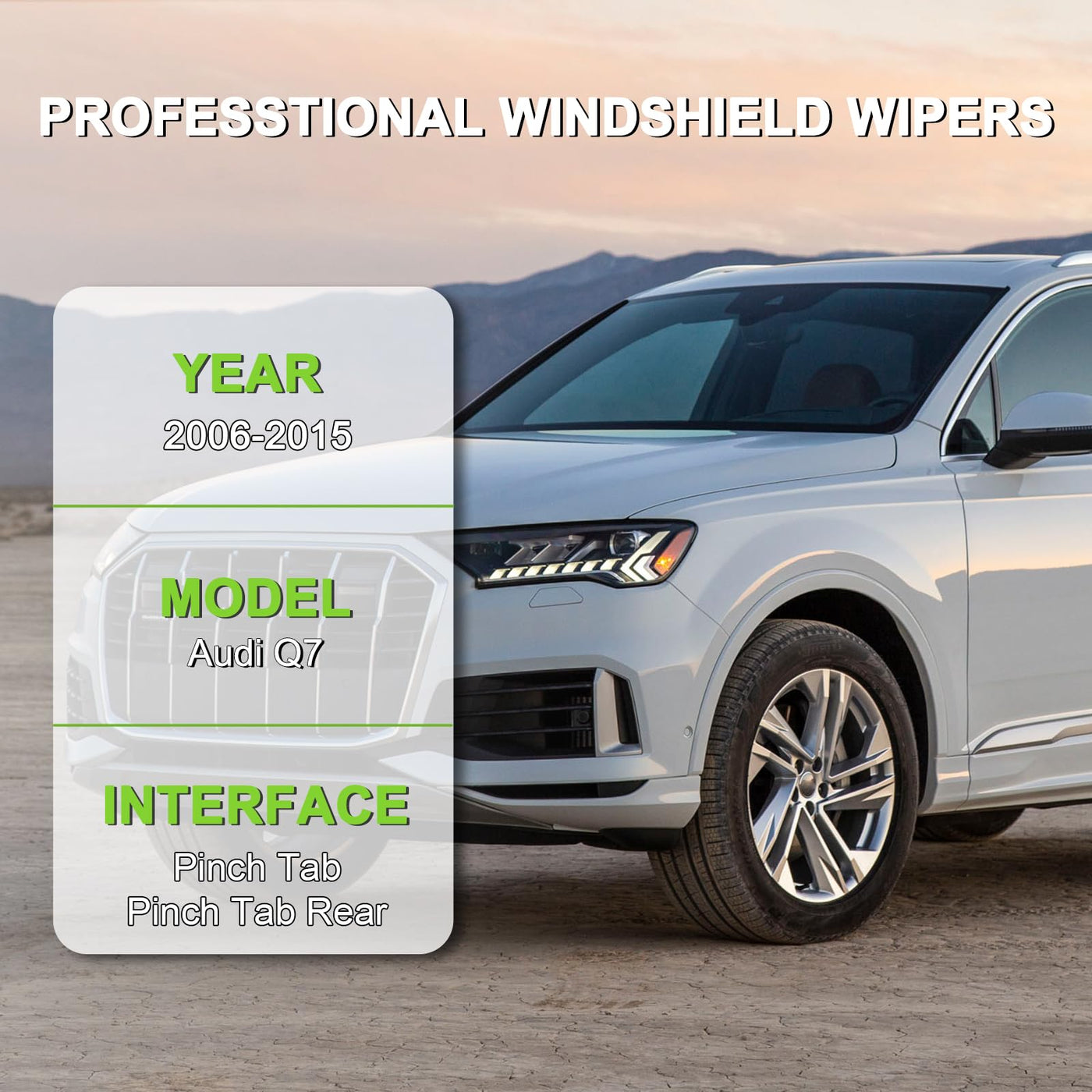 ?Fitment?Replacement For 2006-2015 Audi Q7 Front And Rear Windshield Wiper Blades. ?Performance? Aerodynamic Design Significantly Reduces Drag, Noise, And Wind Lift. Bracketless Design Wiper Blades For My Car That Help Prevent Snow And Ice Buildup. Tested To Ensure Trouble-Free Installation And Performance. ?What You Get?Universal Pinch Tab Front Windshield Wipers And J Hook,Snap Claw Rear Wiper.Complete Set Of 3 Wiper Blades,Left-Right-Back.Replace Oem Number:4L1998002;4L1955425B; 4L1955426A,4L0955425; 4L0 955 425. ?Easy Installation?Durable Windshield Wipers For My Car, For All Seasons And Weather, Easy To Install Without The Need For Other Tools. ?Worry Free After-Sales Service?Parrati Provides 24-Hour Online Service To Solve Customer Problems In A Timely Manner, And 6 Months Of After-Sales Service.