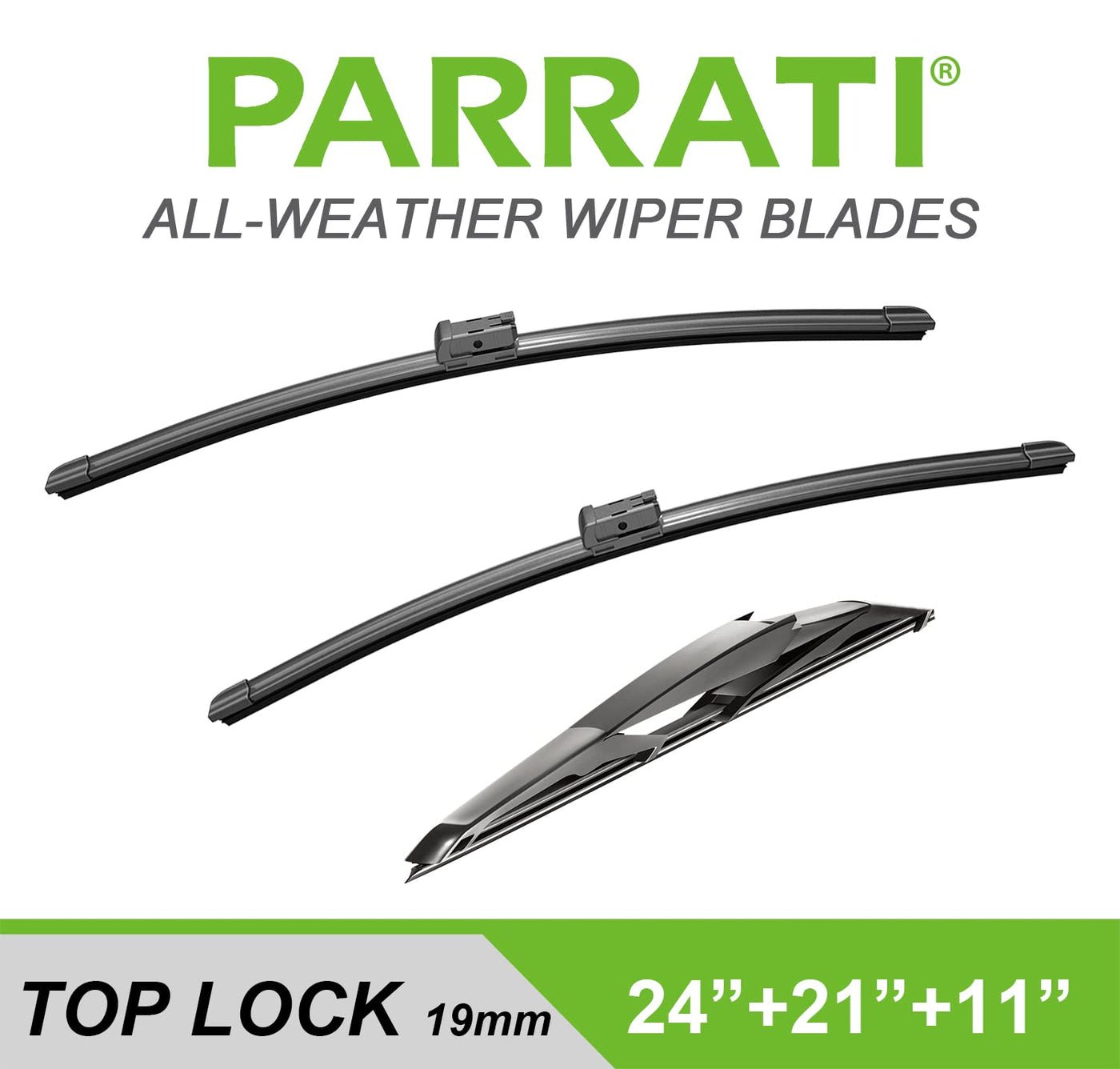 Q: What sizes are included in the PARRATI® wiper blade set?A: The PARRATI® set includes three wiper blades in sizes 24 inches, 21 inches, and 11 inches, which cover the front and rear windshields of compatible vehicles.