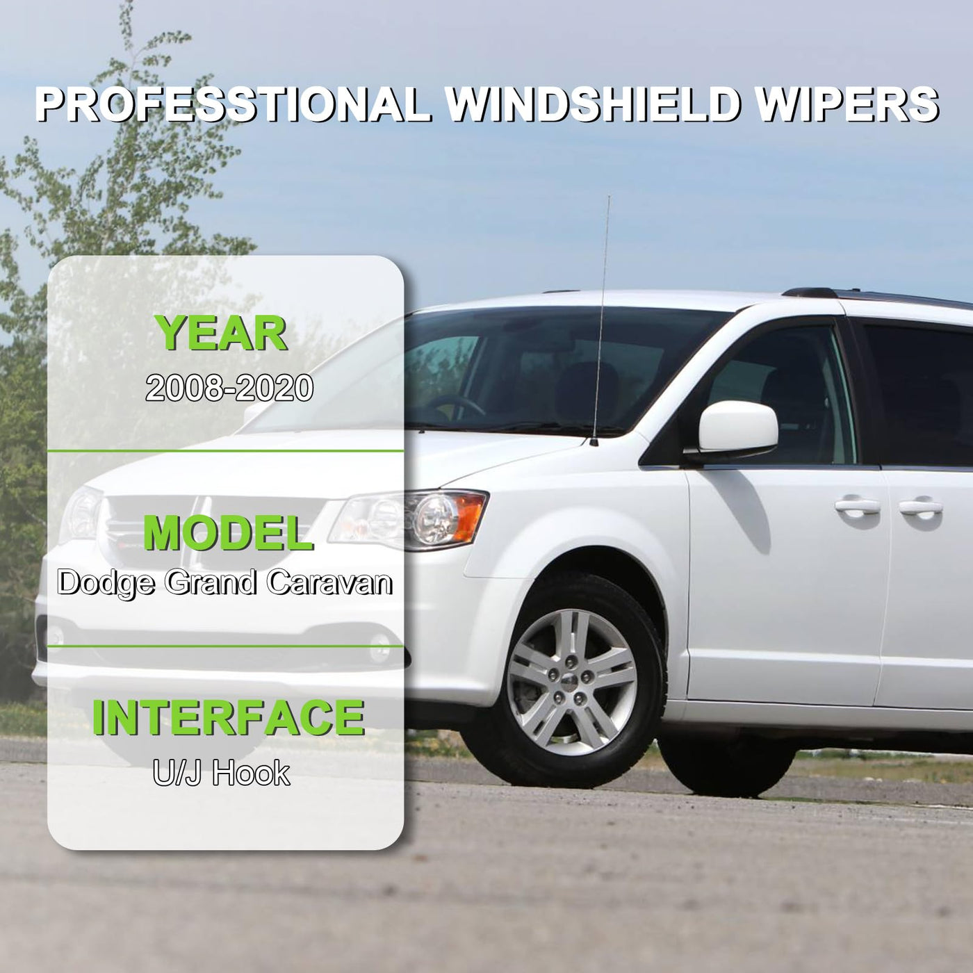 ?Fitment?Replacement For 2008-2016 Chrysler Town & Country,2008-2020 Dodge Grand Caravan Front And Rear Windshield Wiper Blades. ?Performance? Aerodynamic Design Significantly Reduces Drag, Noise, And Wind Lift. Bracketless Design Wiper Blades For My Car That Help Prevent Snow And Ice Buildup.Tested To Ensure Trouble-Free Installation And Performance. ?What You Get?Universal J Hook Front And Rear Windshield Wipers.Complete Set Of 3 Wiper Blades,Left-Right-Back.Replace Oem Number:68125735Aa;68028442Aa,68078307Aa;68078307Ab. ?Easy Installation?Durable Windshield Wipers For My Car, For All Seasons And Weather, Easy To Install Without The Need For Other Tools. ?Worry Free After-Sales Service?Parrati Provides 24-Hour Online Service To Solve Customer Problems In A Timely Manner, And 6 Months Of After-Sales Service.