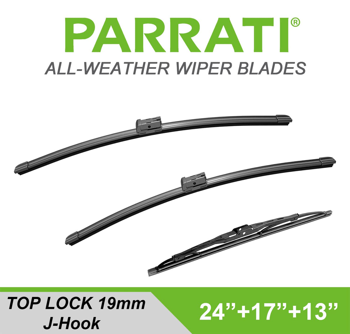 Q: What sizes are included in the PARRATI® Wiper Blades pack?A: The PARRATI® Windshield Wiper Blades pack includes three blades in sizes 24 inches, 17 inches, and 13 inches, ensuring compatibility with various configurations of your vehicle.