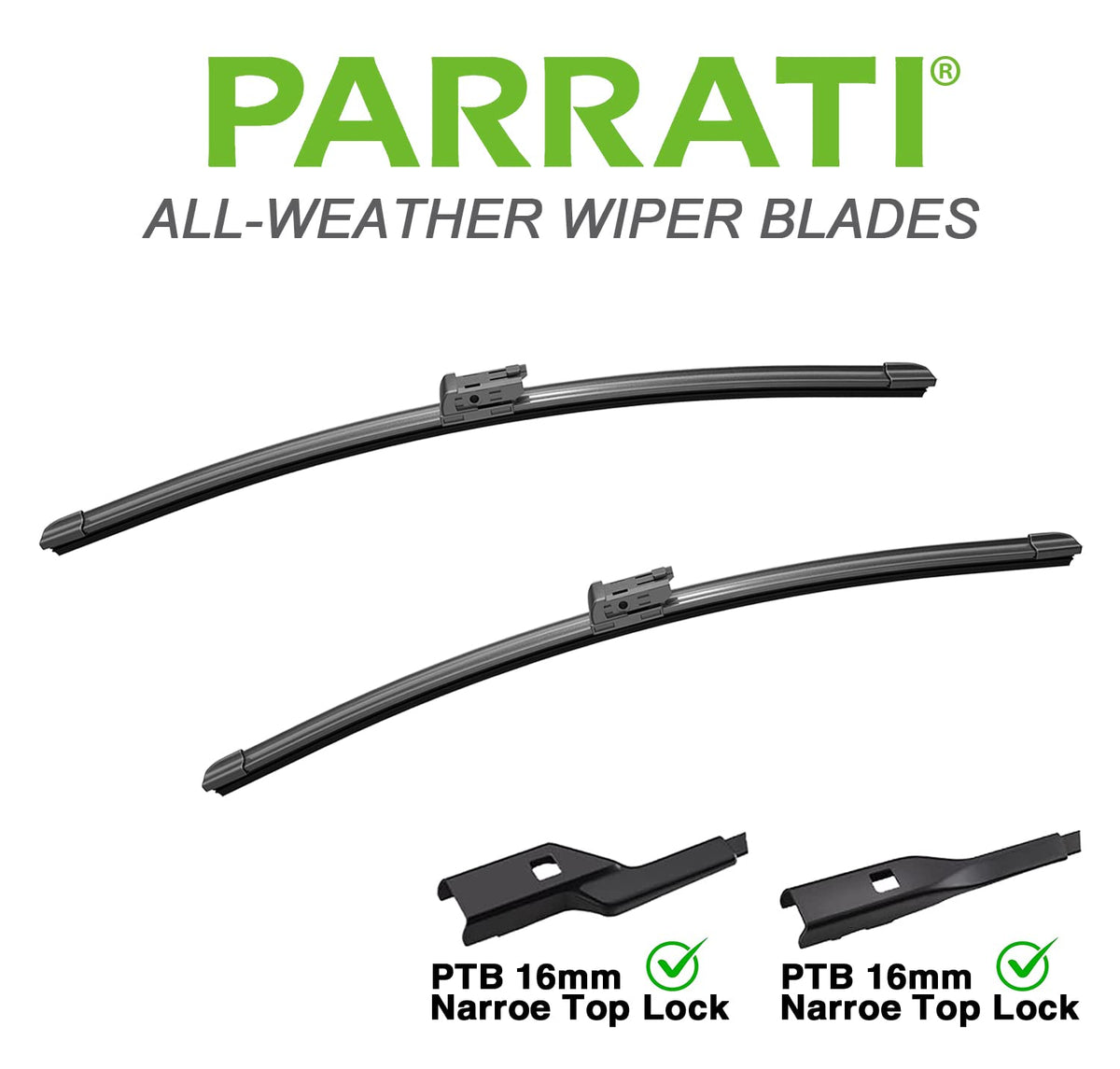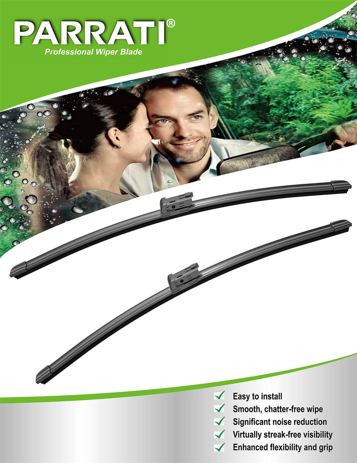 Q: What materials are used in the construction of these wipers?A: The PARRATI® windshield wipers are made from premium natural rubber, which ensures a smooth and chatter-free wiping experience, along with a durable construction that withstands various weather conditions.
