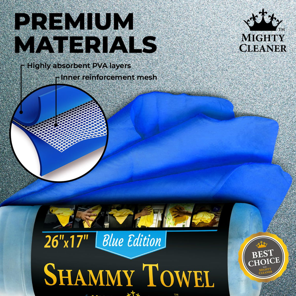 Q: What material is the Mighty Cleaner chamois towel made from?A: The Mighty Cleaner chamois towel is crafted from high-quality polyvinyl alcohol (PVA), which provides superior absorbency and a long-lasting performance for all your drying needs.
