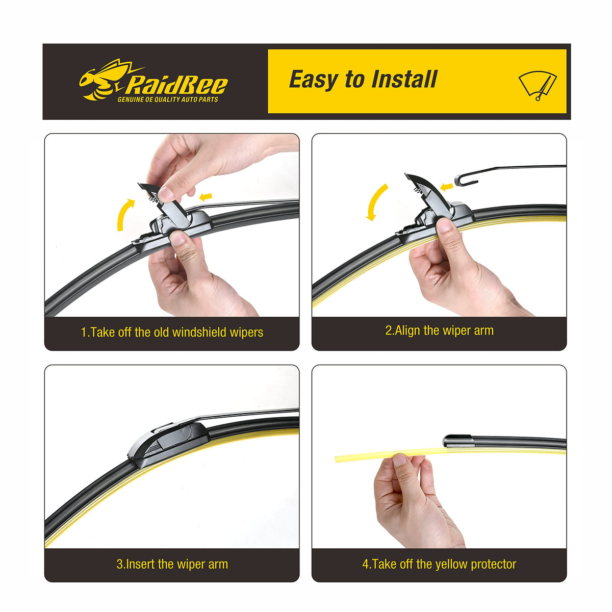 Q: How do I install the RaidBee Wiper Blades?A: Installation of the RaidBee wiper blades is straightforward and can be completed in just one minute. Simply remove the old blades and attach the new ones following the included instructions for ease.