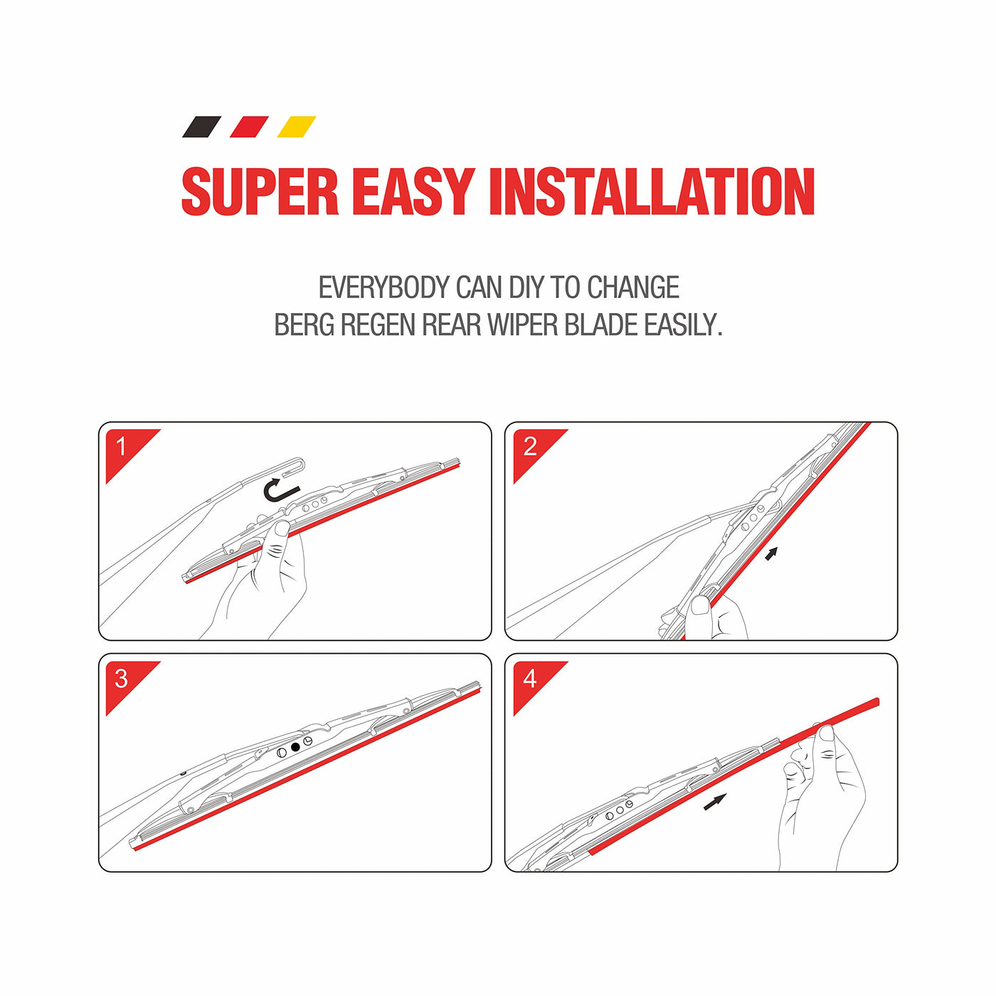 Q: How do I install the 10-inch rear wiper blades?A: Installing the 10-inch rear wiper blades is straightforward. Simply lift the wiper arm away from the windshield, remove the old blade by pressing the release tab, and slide it off. Then slide the new BERG REGEN blade onto the arm until you hear a click, ensuring it is securely in place.