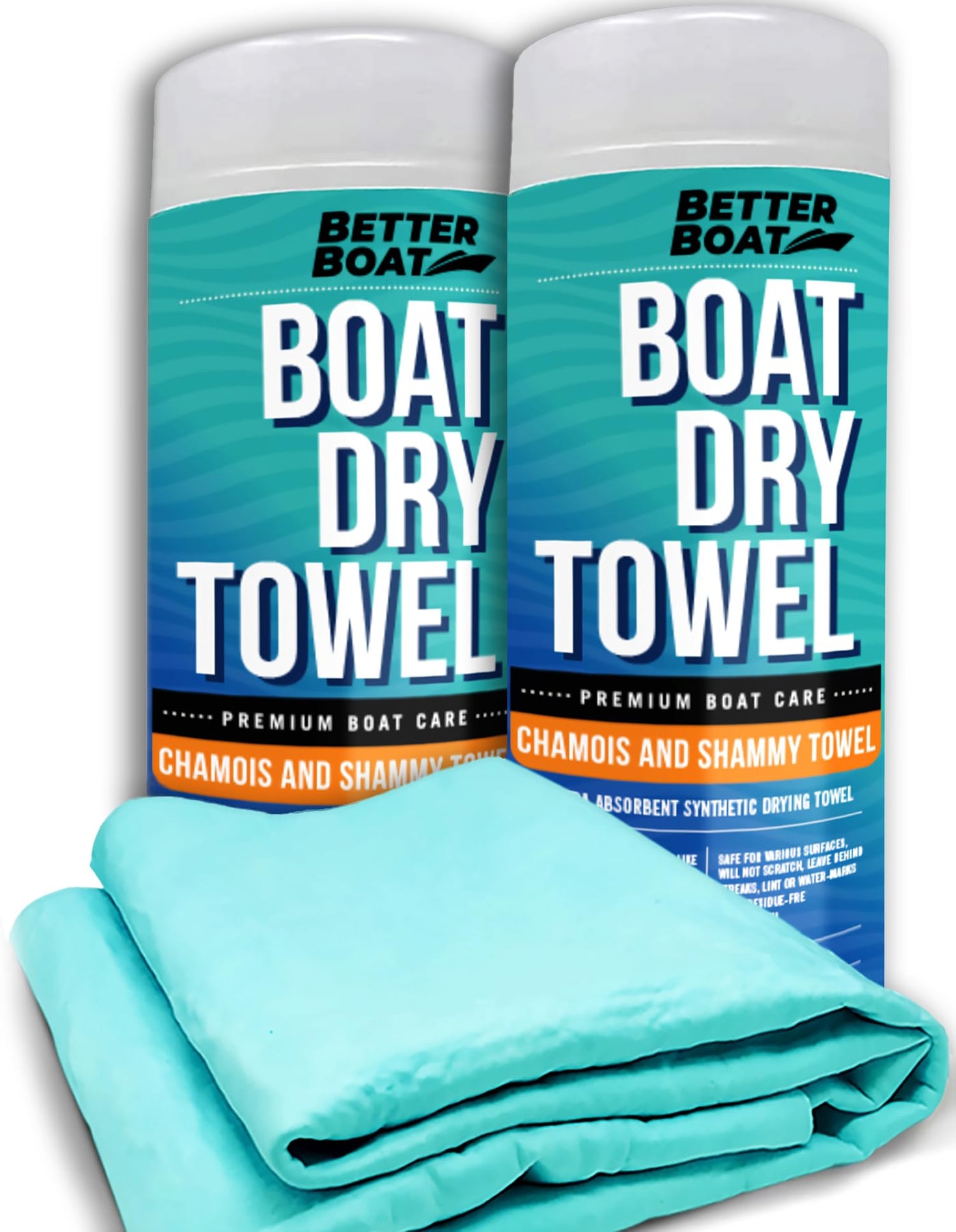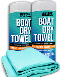 Our premium highly absorbent synthetic shammy drying towel is super soft and will never scratch surfaces, leave lint or streaks behind, it can be used wet or dry to care for your boat, home or car and works great with our Better Boat cleaning products. This 25 inch x 17 inch multi-purpose water absorber shammy is strong, durable, long-lasting, machine washable, animal cruelty-free and vegan and can be used to dry just about anything, your boat, as a car drying cloth or a dish shammy - the uses are endless! DIRECTIONS: Remove Boat Dry Towel from canister. Submerge towel in warm water for 3 minutes. Wring out towel to remove excess water. Use towel to dry or dust exterior or interior of boat or automobile. Once done, rinse towel with clean water, keep the towel slightly moist, roll up and store in canister. Note: if towel becomes stiff, simply submerge in water for three minutes. Towel is machine washable but do not put towel in a dryer. We proudly stand behind the quality of all our products! We are a family owned American business committed to making premium quality products.