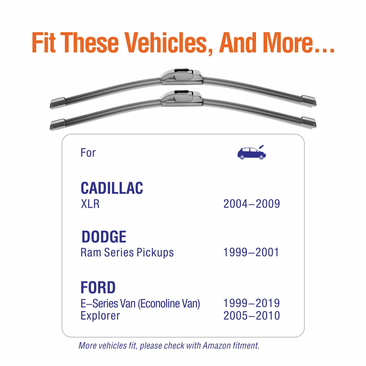 Q: What vehicles are compatible with WOWIPER OE Quality Wiper Blades?A: WOWIPER OE Quality Wiper Blades are compatible with a variety of vehicles, including Ford F150, F250, F350, F450, F550 from 1999 to 2008, as well as the Expedition (1997-2007), Explorer (2005-2010), and Mustang (1999-2004). They also fit Chevy S10 models from 1999 to 2004 and more.