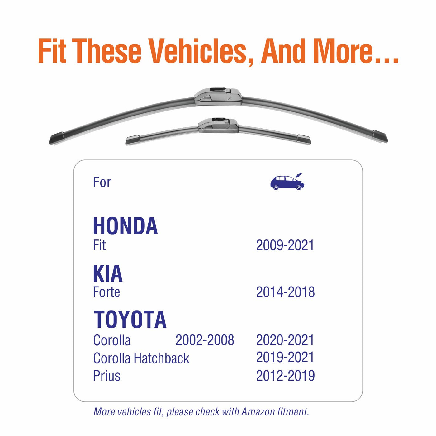 Q: What vehicles are compatible with the WOWIPER windshield wiper blades?A: The WOWIPER windshield wiper blades are designed to fit various models, including the Hyundai Elantra (2011-2016), Toyota Corolla (2019-2022, 2020), Prius C (2012-2019), and Honda Fit (2009-2022), among others.
