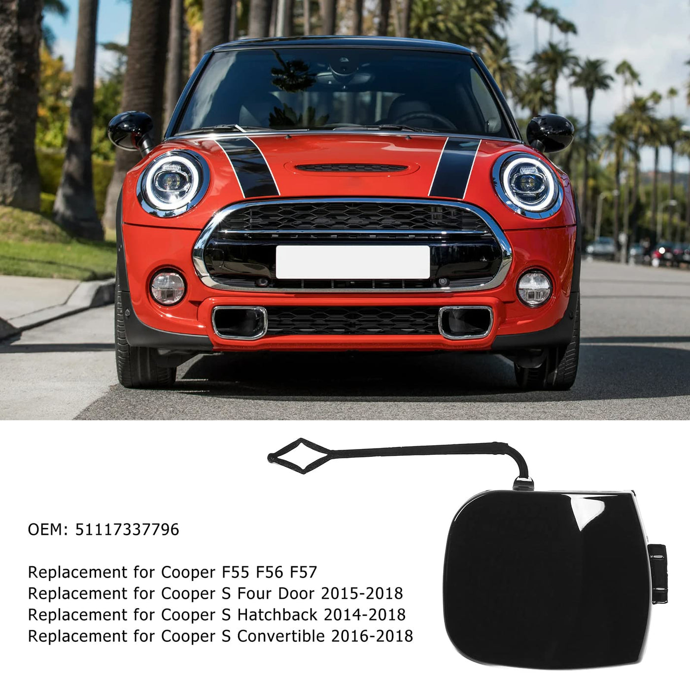 Specifications:Item Type: Front Bumper Towing Hook CoverOEM: 51117337796Fitment: for Cooper F55 F56 F57for Cooper S Four Door 2015-2018for Cooper S Hatchback 2014-2018for Cooper S Convertible 2016-2018Package List:1 xFront Bumper Towing Hook Cover