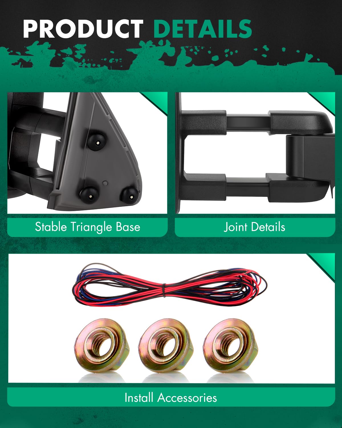 Comes as a PAIR Fits both LH (Driver Side) & RH (Passenger Side) | Heated Power Function on Glass movement Manual Telescoping Folding | width Lamp Turn Signal On glass and on the back of mirror.Buyer needs to do own wiring. Wire included, no instruction with mirrors. | For 1999-2002 For Chevy Silverado For GMC Sierra Pickup 2000-2002 Tahoe (Excluding V8 5.7L) Yukon (Excluding V8 5.7L) | Fit 2002 For Chevy Avalanche 1500 2500/ 2000-2002 Suburban Yukon XL 1500 2500