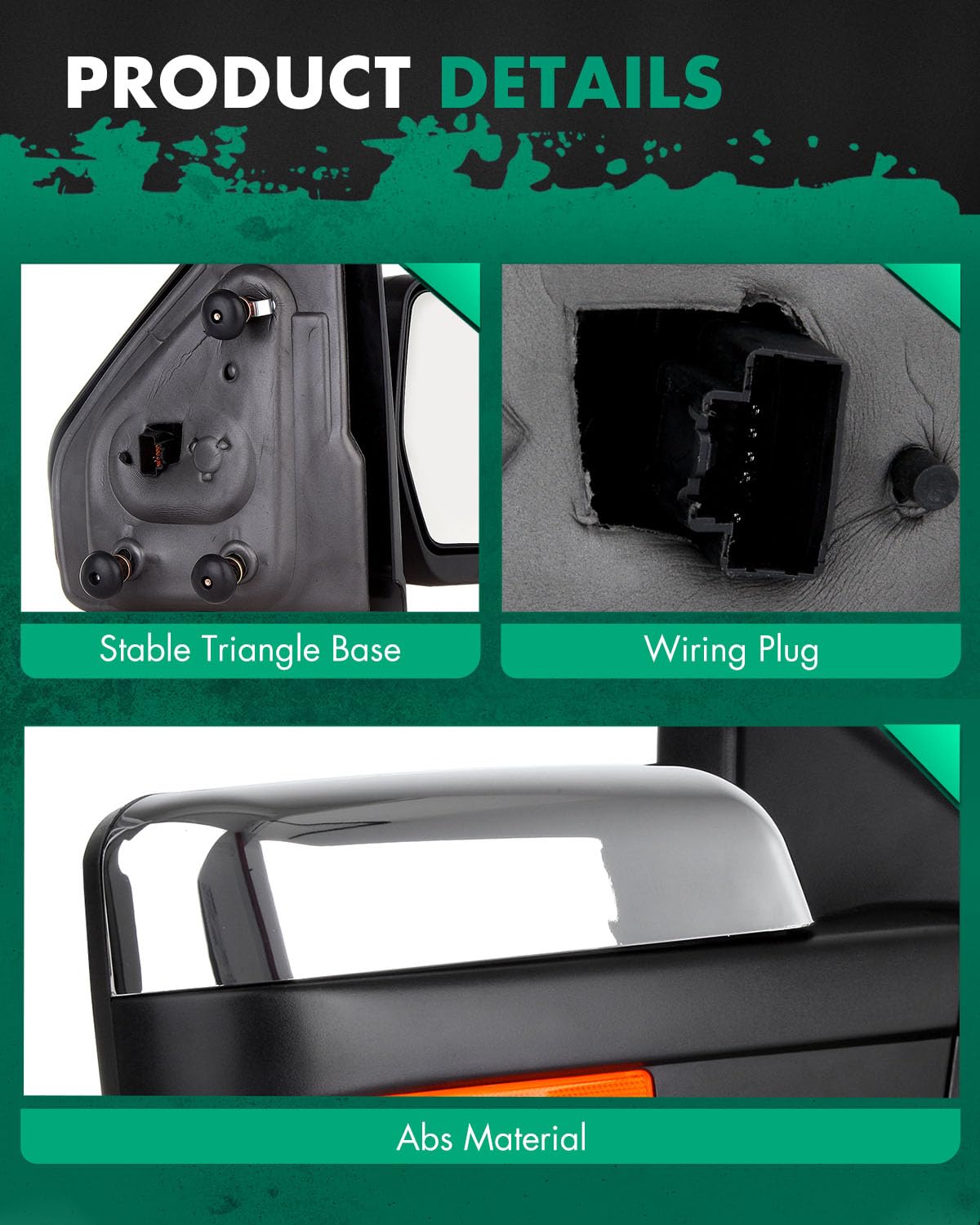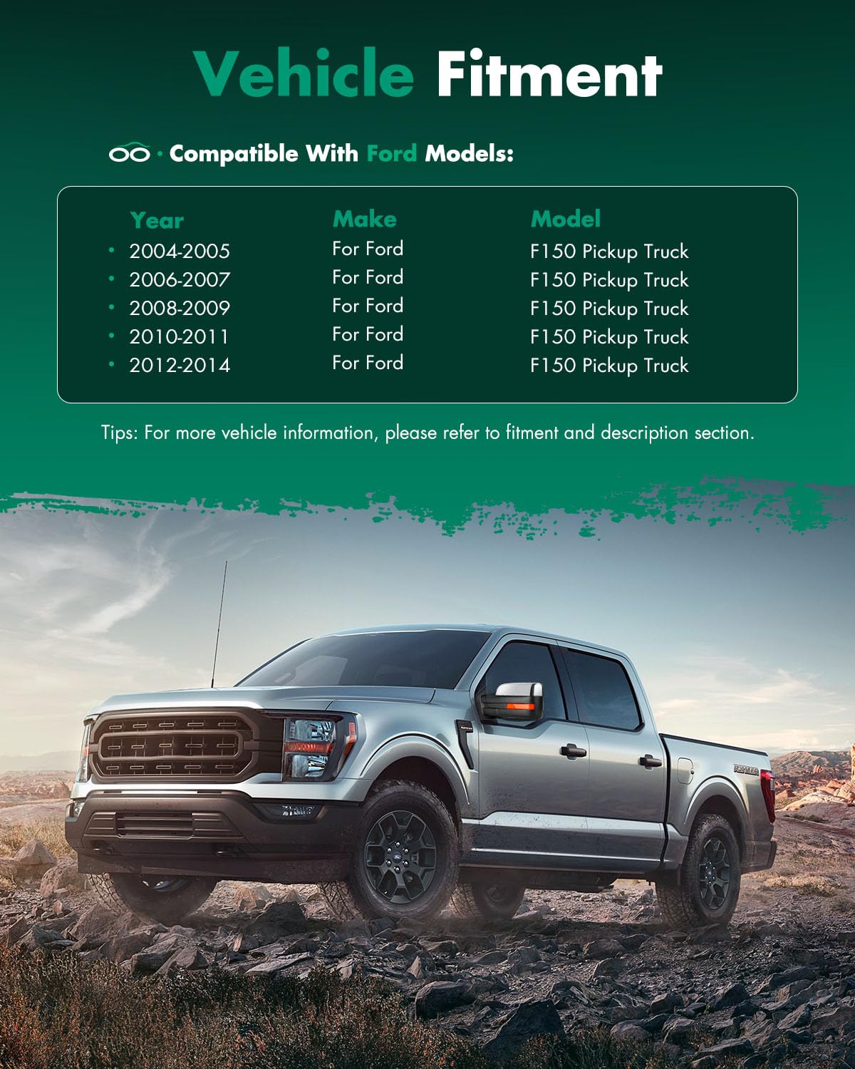 ???FITSMENT? - Fit For 2004-2014 For Ford For F150 1997-1999 For Ford For F250 | ???POWER MIRROR ADJUSTMENT? - The power mirror adjustment will let you change your mirror face position with the factory controls inside your vehicle | ???HEATED? - The large mirror has a heat function. It's going to melt away ice, and its also going to prevent it from fogging up. | ???TURN SIGNAL? - Here under the face of the mirror, we have a amber turn signal that is a high intensity amber lamp so you're going to be able to see it from quite a ways away. | ???PUDDLE LIGHT? - Puddle lamp illuminates the isa under the mirror