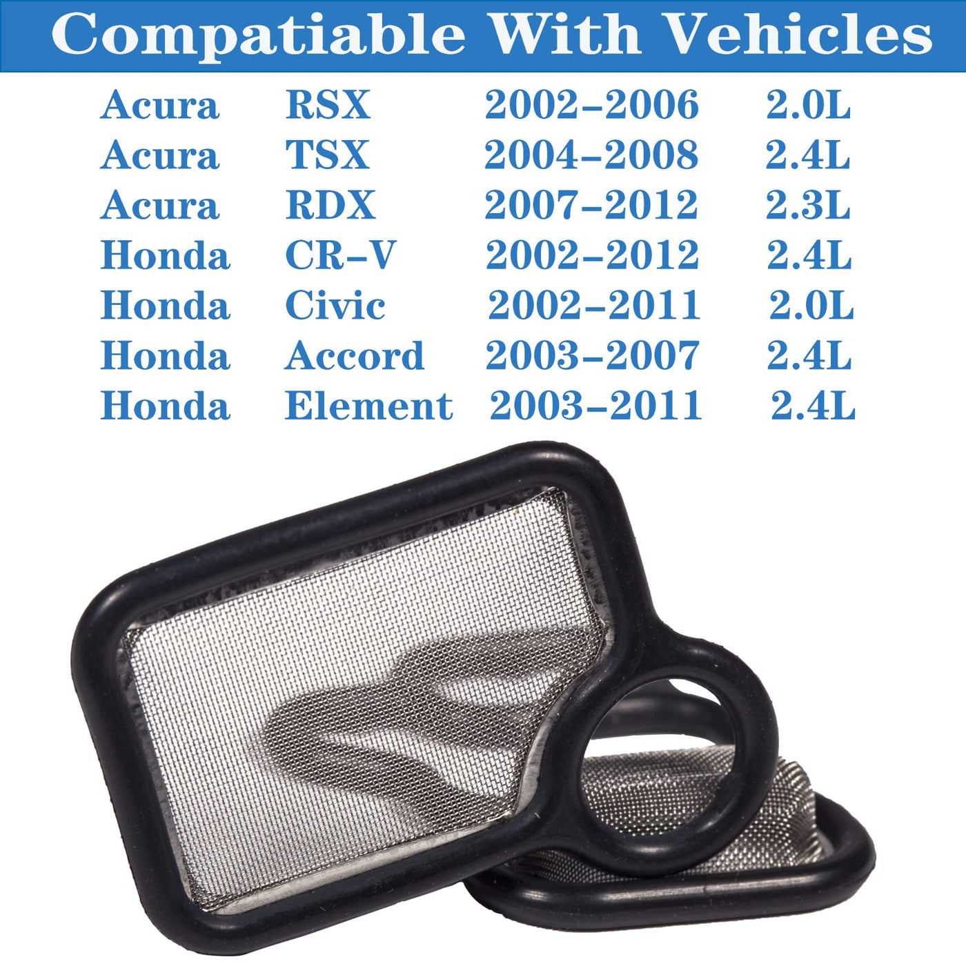 Q: What vehicles are compatible with the Honda Spool Valve Filter Screen?A: The Honda Spool Valve Filter Screen is compatible with a range of Honda and Acura vehicles, including 2002-2009 Honda CR-V, 2003-2007 Honda Accord, 2003-2011 Honda Element, 2004-2011 Honda Civic Si, 2007-2008 Honda Fit, 2012-2015 Honda Accord Crosstour, 2002-2006 Acura RSX, 2004-2008 Acura TSX, and 2007-2012 Acura RDX.