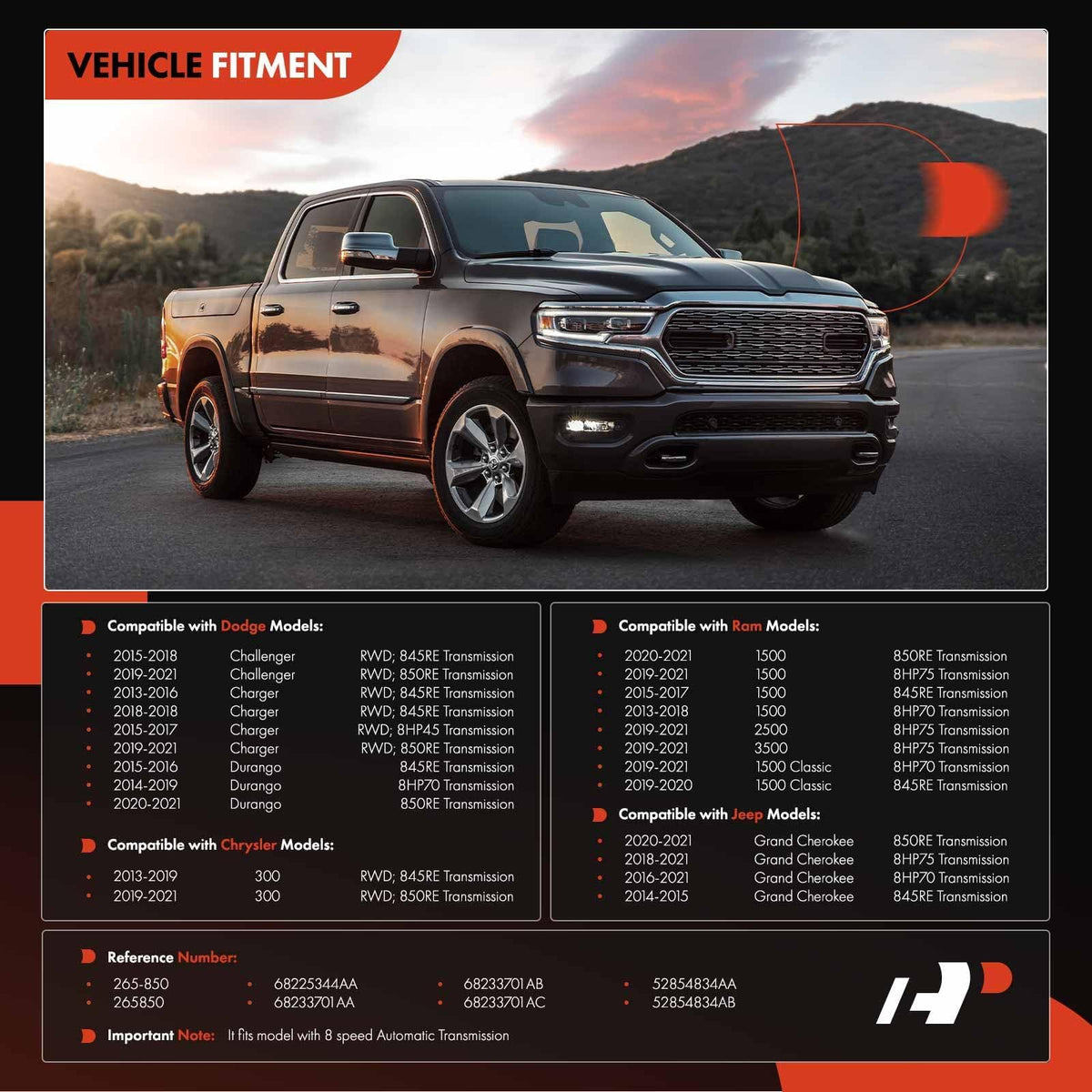 Q: What vehicles are compatible with the A-Premium Transmission Oil Pan?A: The A-Premium Transmission Oil Pan is compatible with several models, including the Chrysler 300 (2013-2021, Rear Wheel Drive), Dodge Challenger (2015-2021, Rear Wheel Drive), Dodge Charger (2013-2021, Rear Wheel Drive), Durango (2014-2021), Jeep Grand Cherokee (2014-2021), and Ram 1500 (2013-2021), 2500 (2019-2021), 3500 (2019-2021), and 1500 Classic (2019-2021). It fits vehicles equipped with an 8-Speed Automatic Transmission.