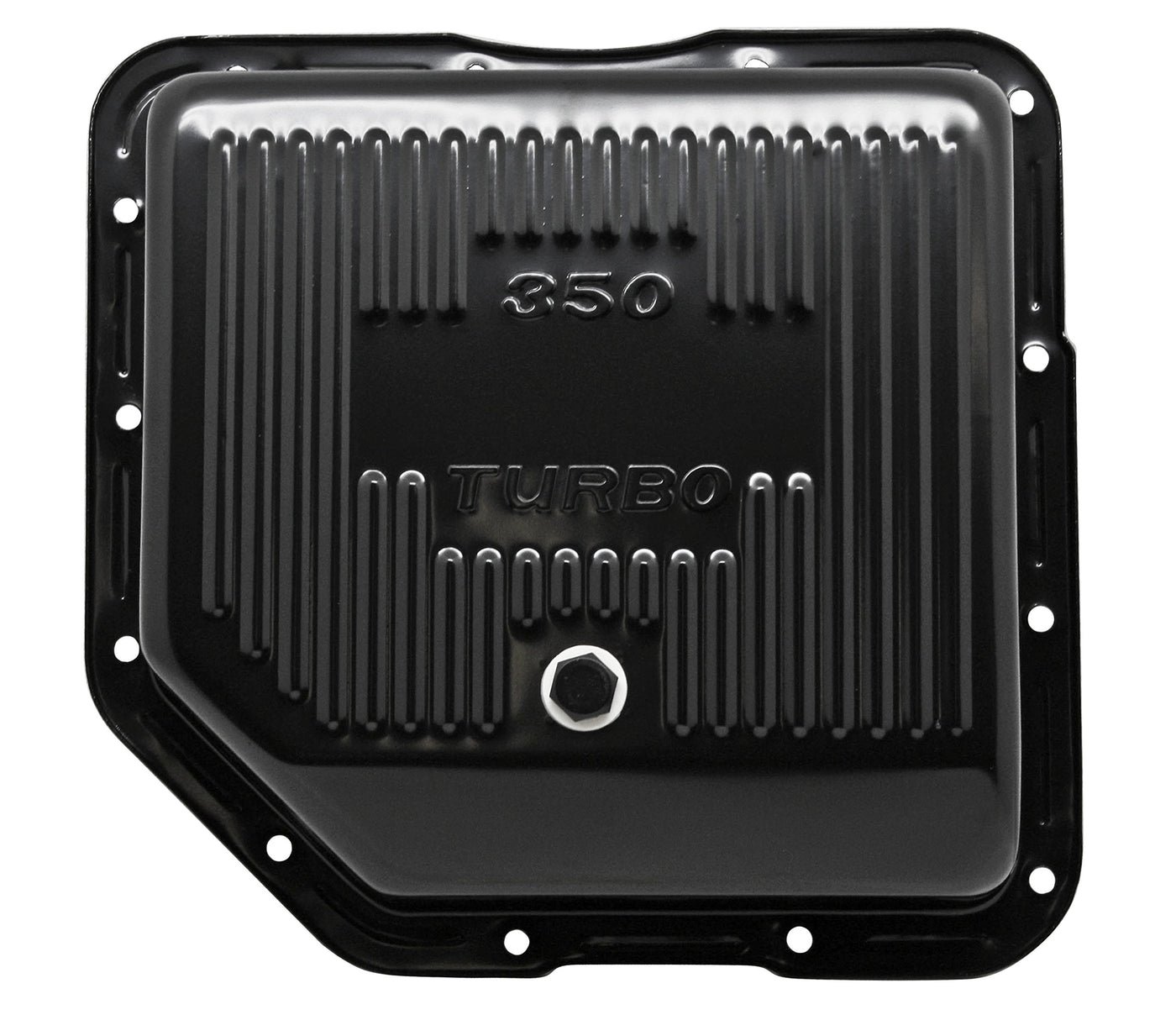 Chevy/GM finned black steel transmission pan fits Turbo 350 transmissions. Features a stamped 350 Turbo logo and comes with drain plug. This model has a deep sump for an extra 2 quarts of fluid. Depth: 2-1/2''.