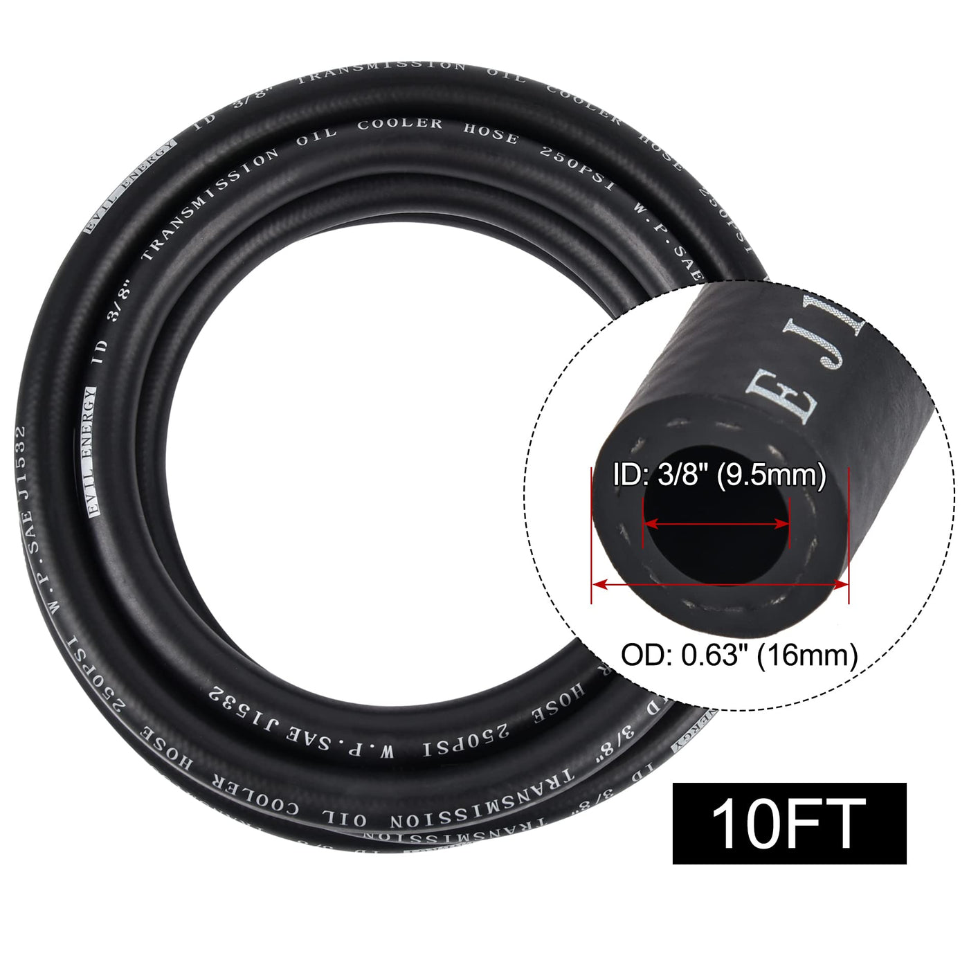 Q: What are the dimensions of the EVIL ENERGY Transmission Oil Cooler Hose?A: The hose has an inner diameter of 3/8 inch (9.5mm) and an outer diameter of 0.63 inch (16mm), with a total length of 10 feet.